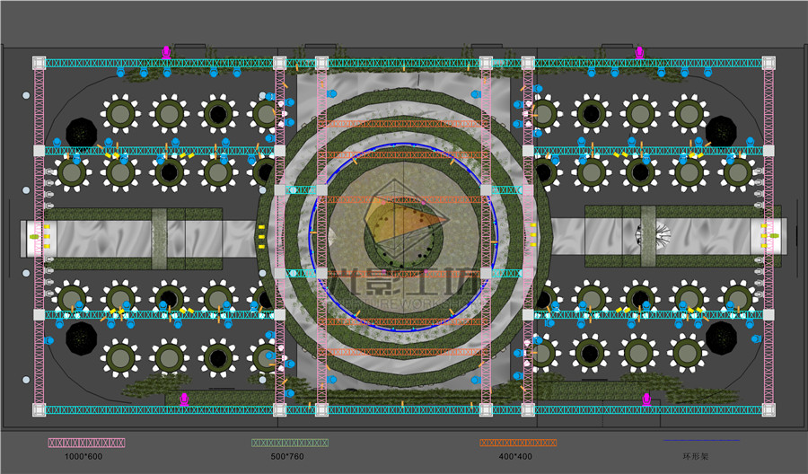 本场婚礼用时60个小时,百余人工,铁艺300组以上,草皮4200多张,Truss架500余米。由于舞台上空同心圆型的主题道具重达3.5吨,结构上采用了婚礼中极少使用的1000*600大型Truss架。
