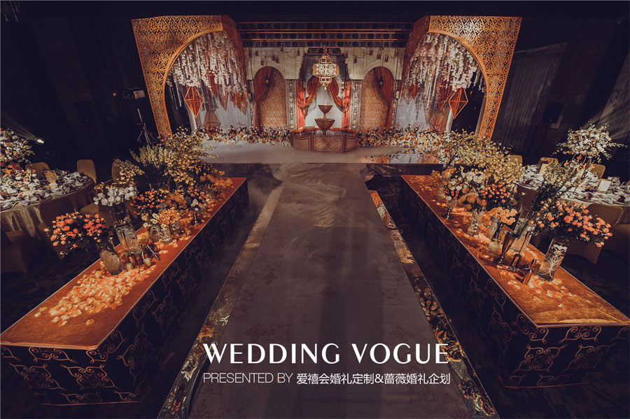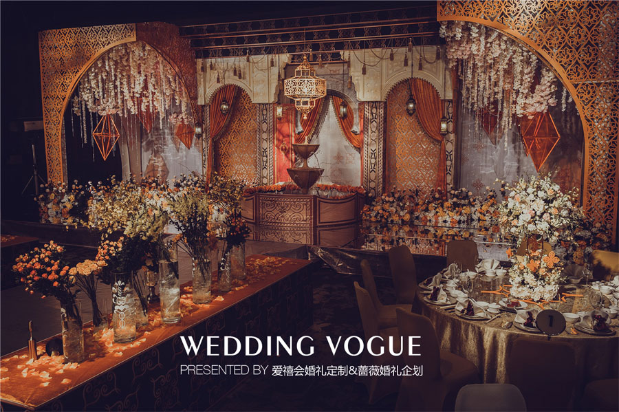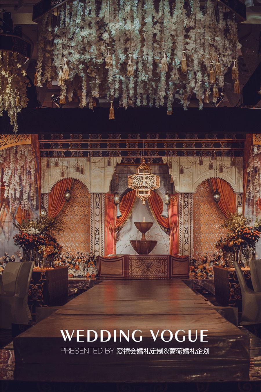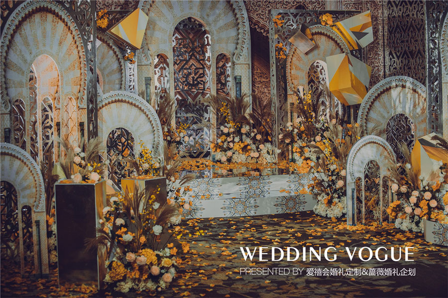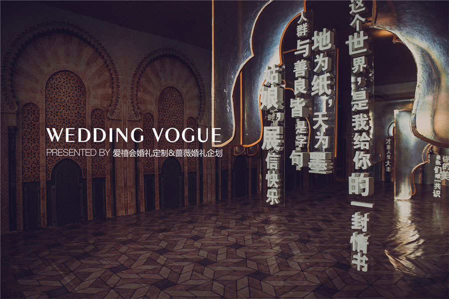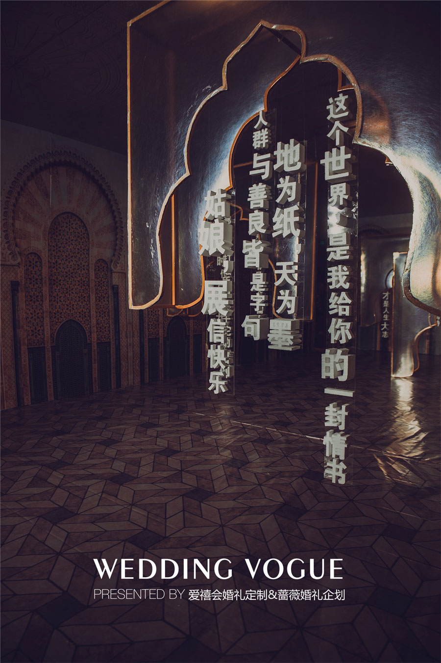 从迎宾区到宴会厅,色彩逐渐加深,层次变化得一点也不突兀,还能给来宾不同视觉体验。强烈的中国文字装饰中的一字一句都是小满写给太太的情话,这样的“大声宣告”,还有这样的风格碰撞,美好得不像话。而从初稿到呈现,爱禧会婚礼定制&蔷薇婚礼企划只花了15天,这就是他们的实力。