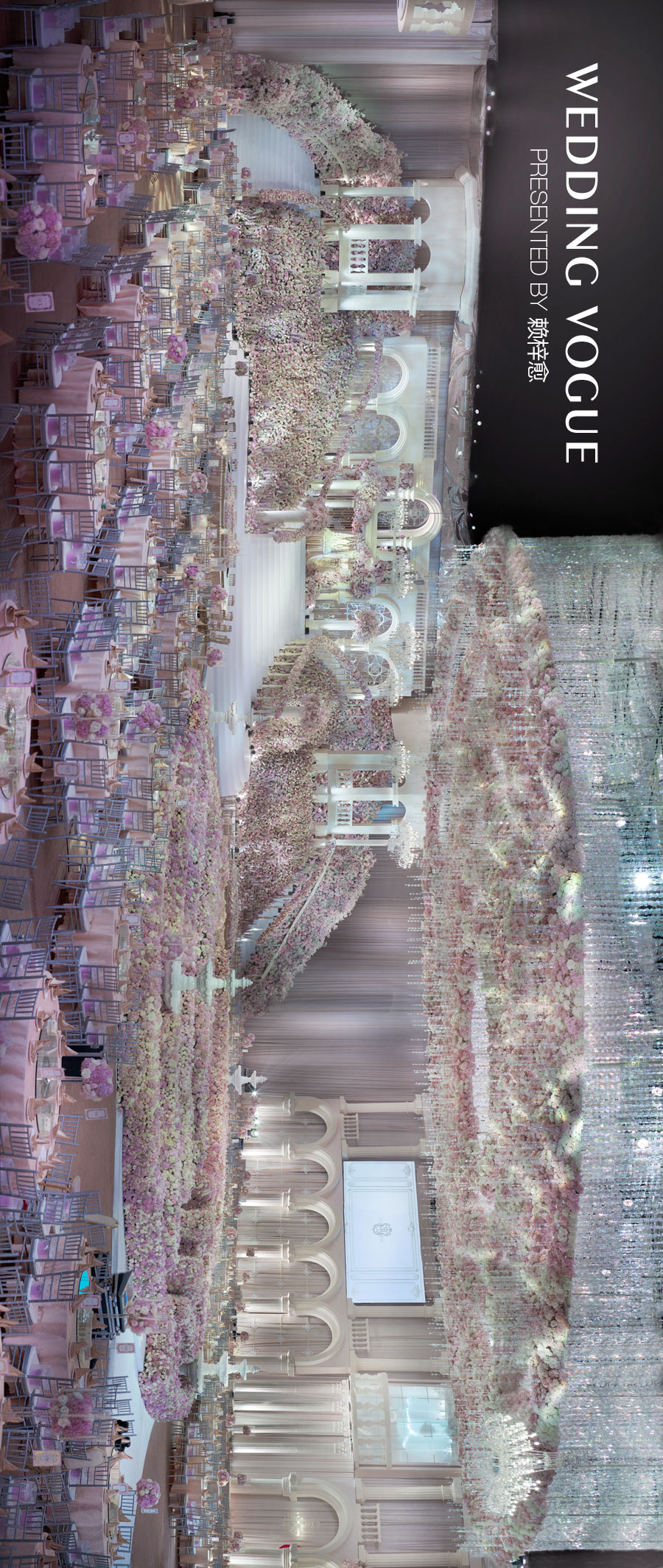 现场包含绣球,紫罗兰,玫瑰,飞燕草等在内的超10w朵近80吨花材,被赖教授运用到以花圃园艺为形态的中心舞台、与中心舞台对称且直径为21米的贝壳水晶吊顶,以及高达15米的主副舞台、餐桌花的设计之中,直观的营造出了新娘所钟爱的花海氛围。