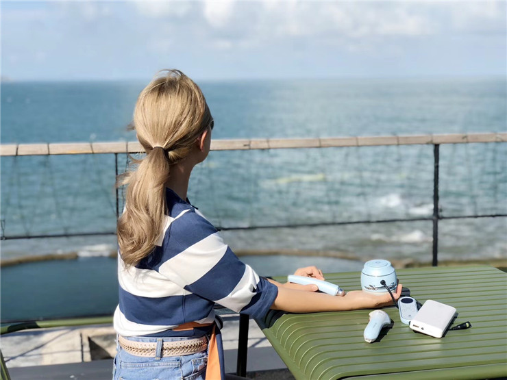 房间大平台,阳光下,无风,摄氏33度,出行必备迷你随身灸:要好气色多灸美容穴~~灸额头印堂穴40分钟,再灸耳朵听宫穴20分钟,出差旅途中,三伏艾灸第36天。
