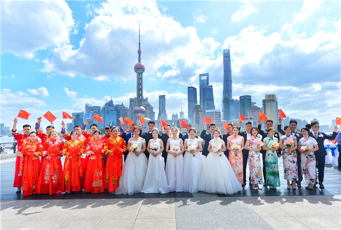 9月19日上午,这是长三角的15对新人在上海玫瑰婚典证婚仪式上齐声高歌,为新中国成立70周年献上他们心中的歌。今年玫瑰婚典证婚仪式暨黄浦区结婚登记户外颁证仪式选择上海著名地标外滩举办,外滩是上海的象征,是上海城市近代化发展的起点。