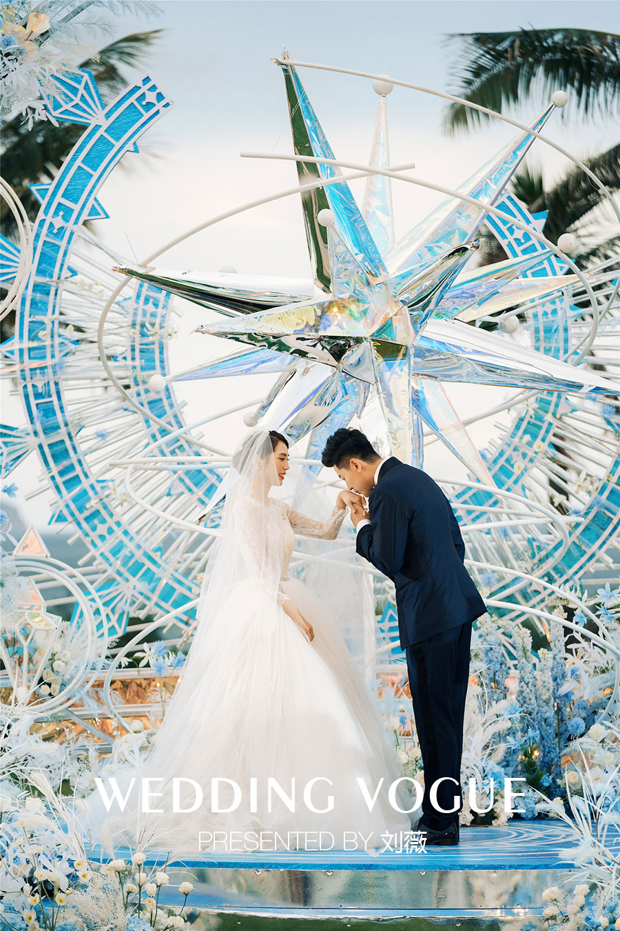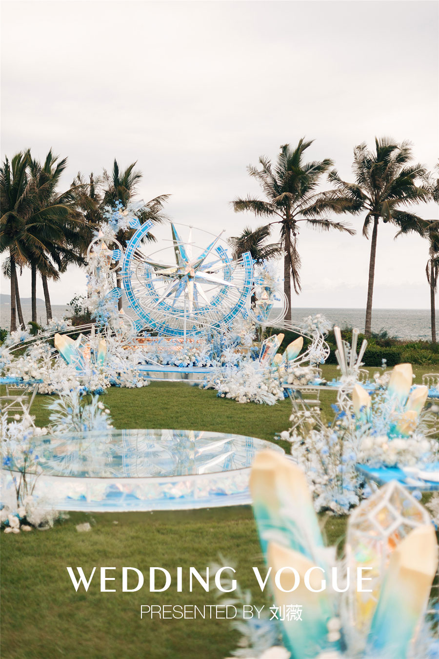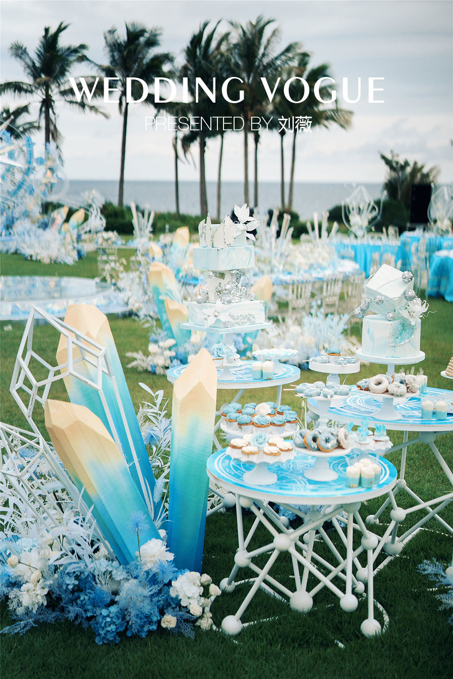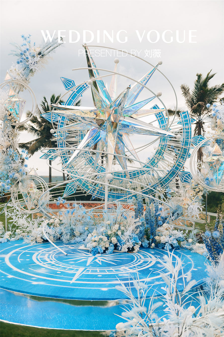 色彩搭配上,一改星空传统的蓝紫色调,选用更为透亮的水蓝色系,蓝白色渐变花艺围绕,