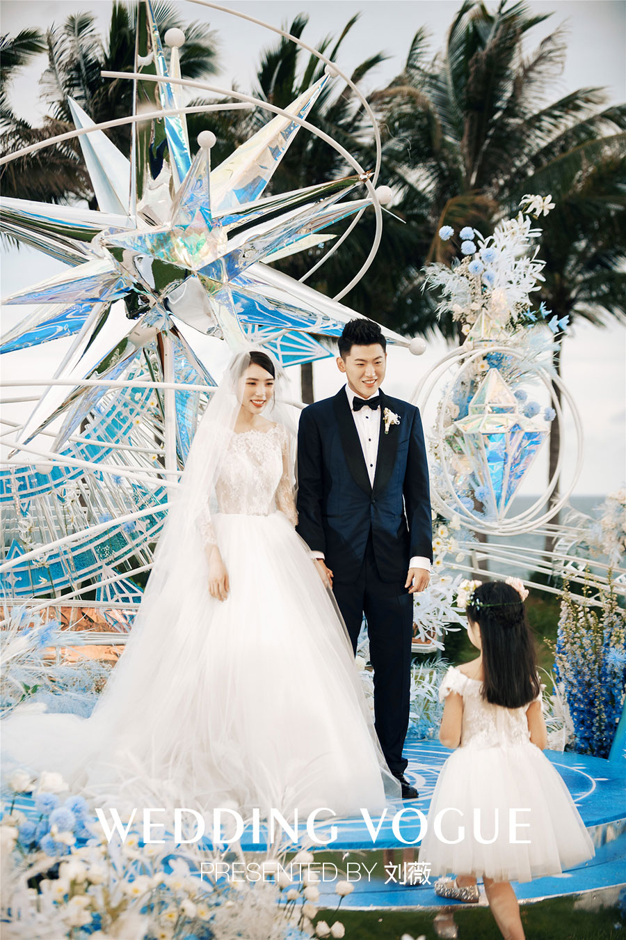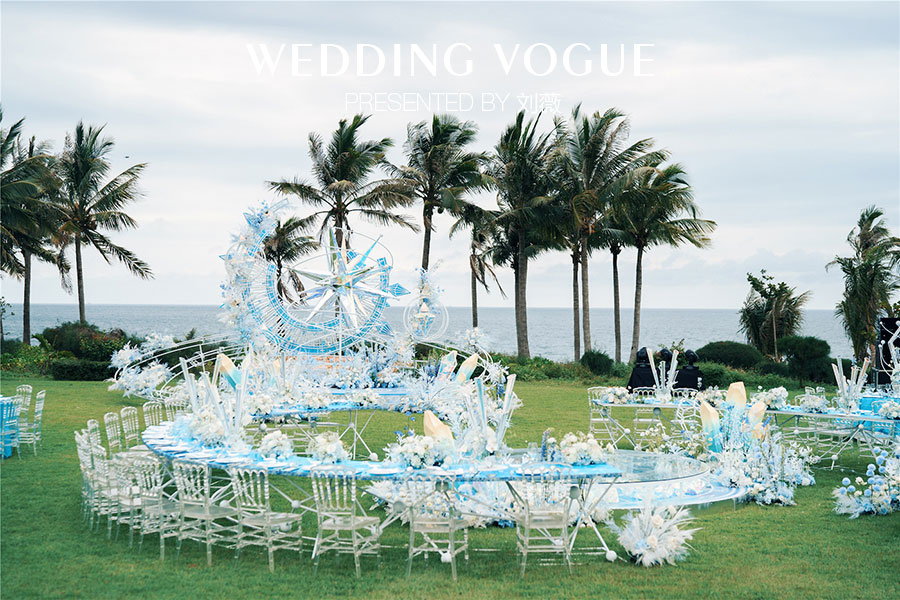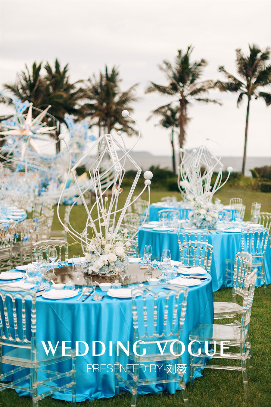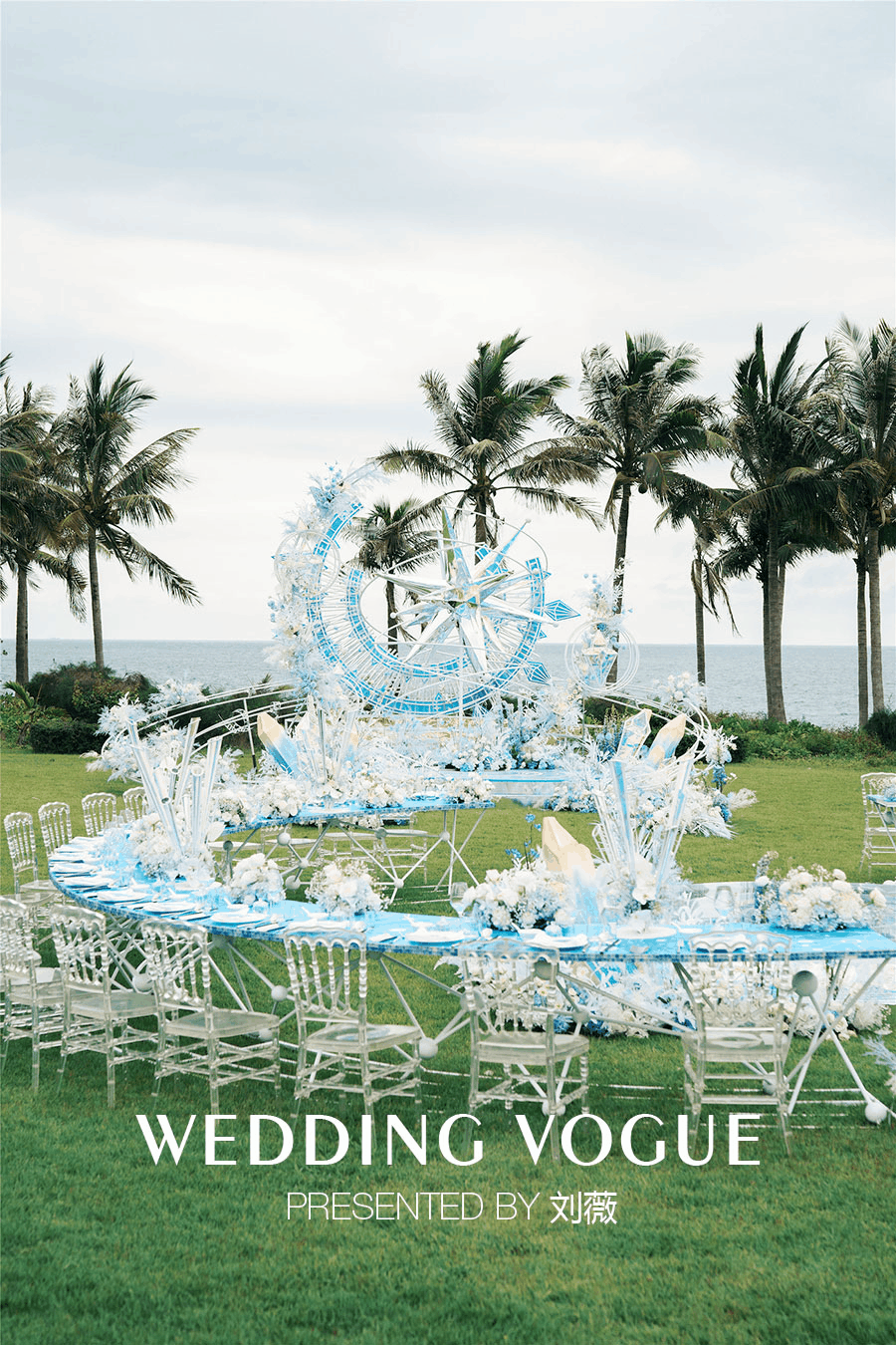 色彩搭配上,一改星空传统的蓝紫色调,选用更为透亮的水蓝色系,蓝白色渐变花艺围绕,