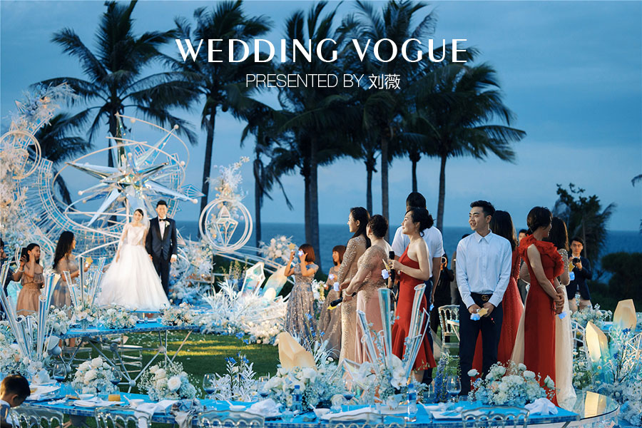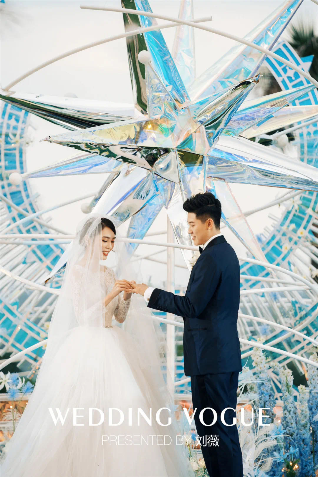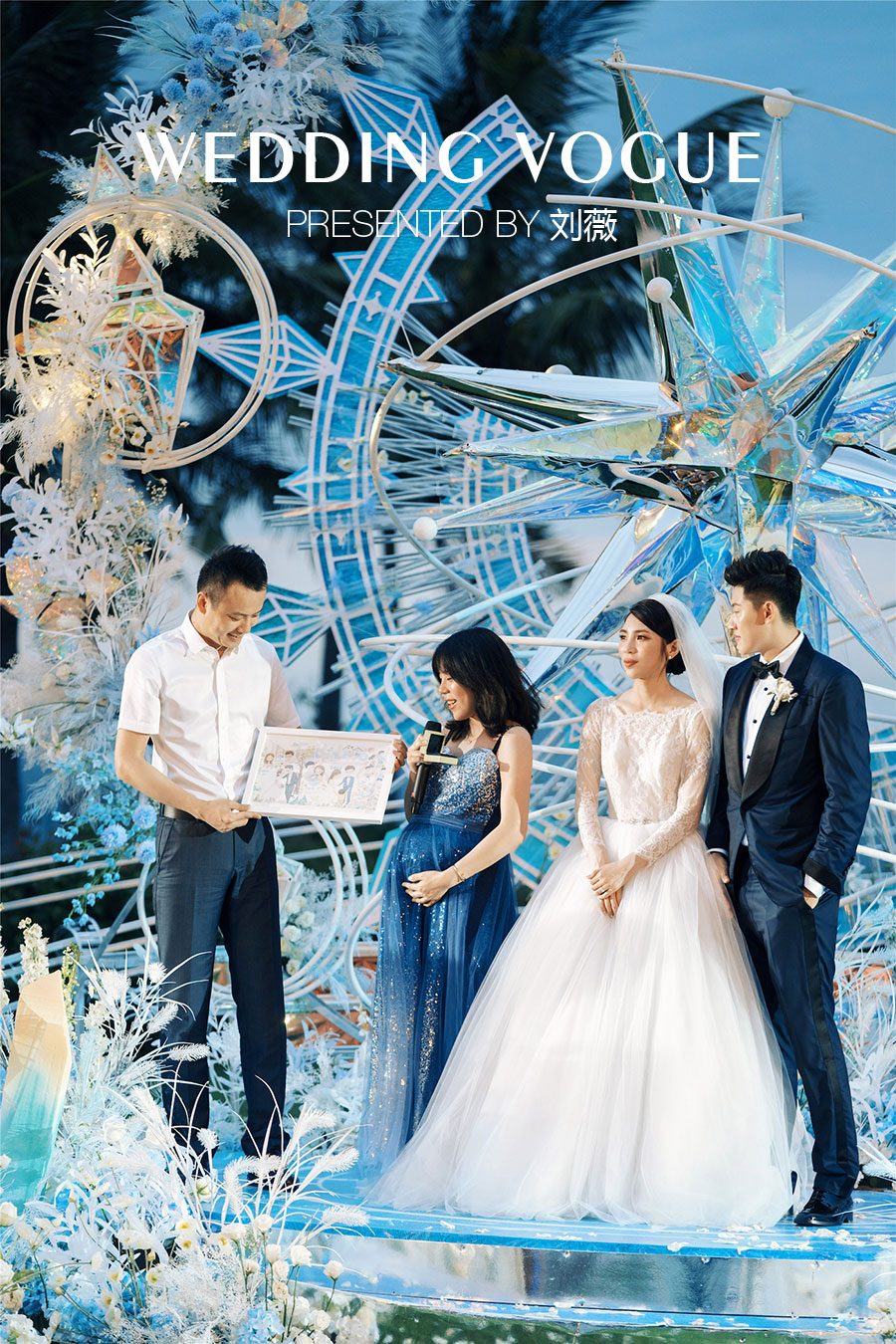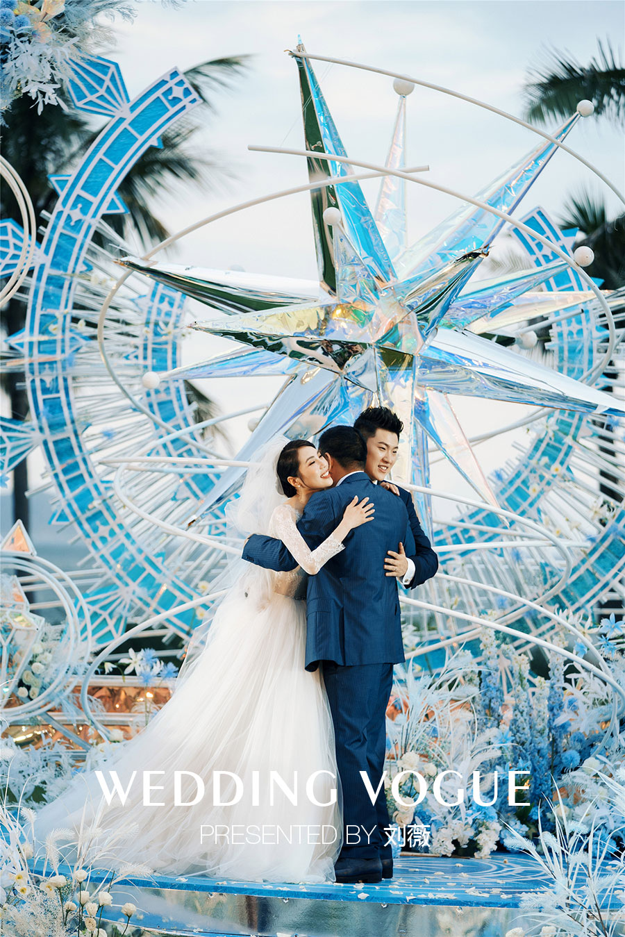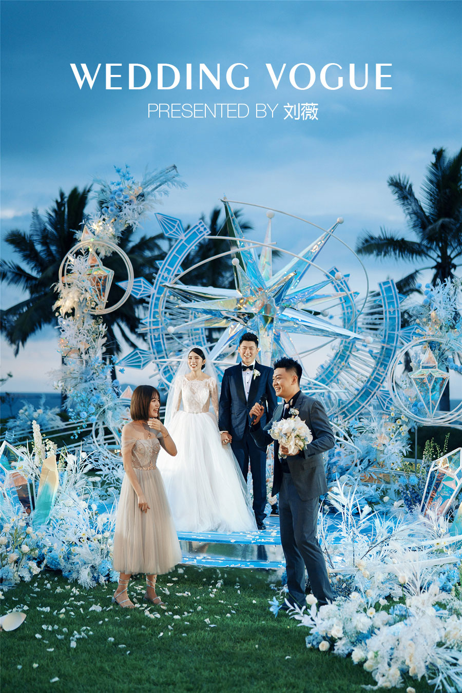 色彩搭配上,一改星空传统的蓝紫色调,选用更为透亮的水蓝色系,蓝白色渐变花艺围绕,
