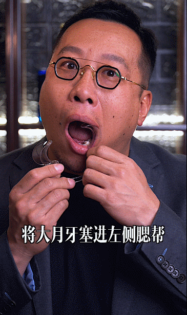 取一人站于桌前,双手紧握开嘴器。大月牙朝后,小月牙朝前,半圆向下。将大月牙塞进左侧腮帮,使劲张口,再将右侧大月牙塞进口中。准备工作完成