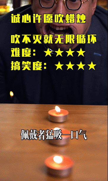 点燃红色复古蜡烛三只,置于桌上。佩戴者猛吸一口气,用力吐出,力求蜡烛全灭!