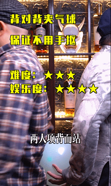 吹出性感圆润气球一只,两人相背而站,臀部同时发力,将气球生生挤破。