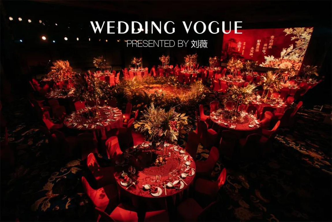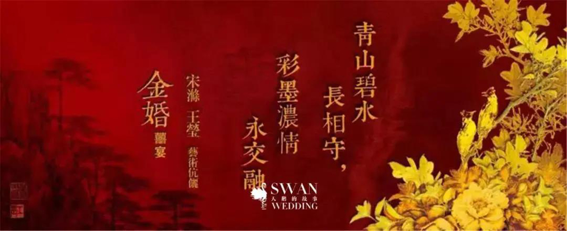 在色彩搭配上,天鹅的故事婚礼定制(后文简称“天鹅的故事”)了解到宋涤先生的山水画大气磅礴,而王莹女士的花却又娇小柔媚。两位画家都是以画中国彩墨画为主,所以决定用酒红色作为主基调,搭配金色点缀。