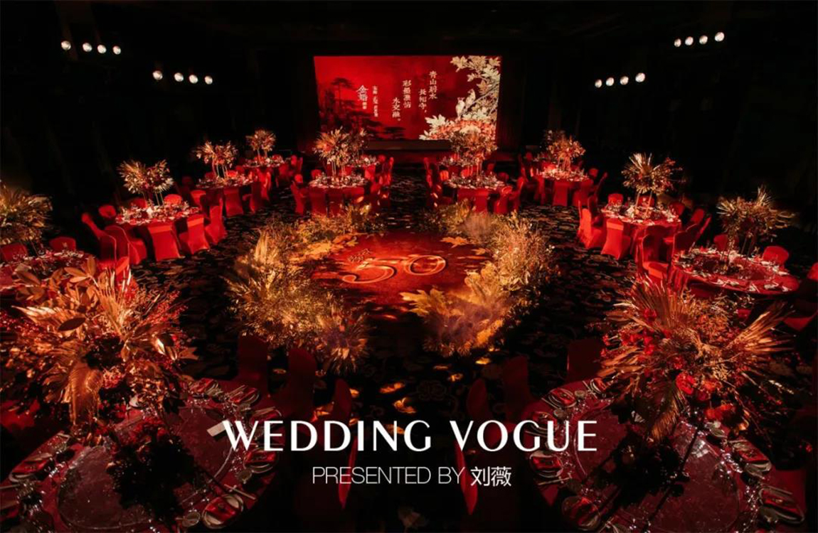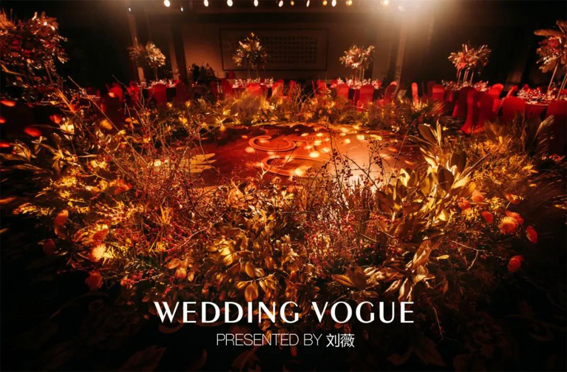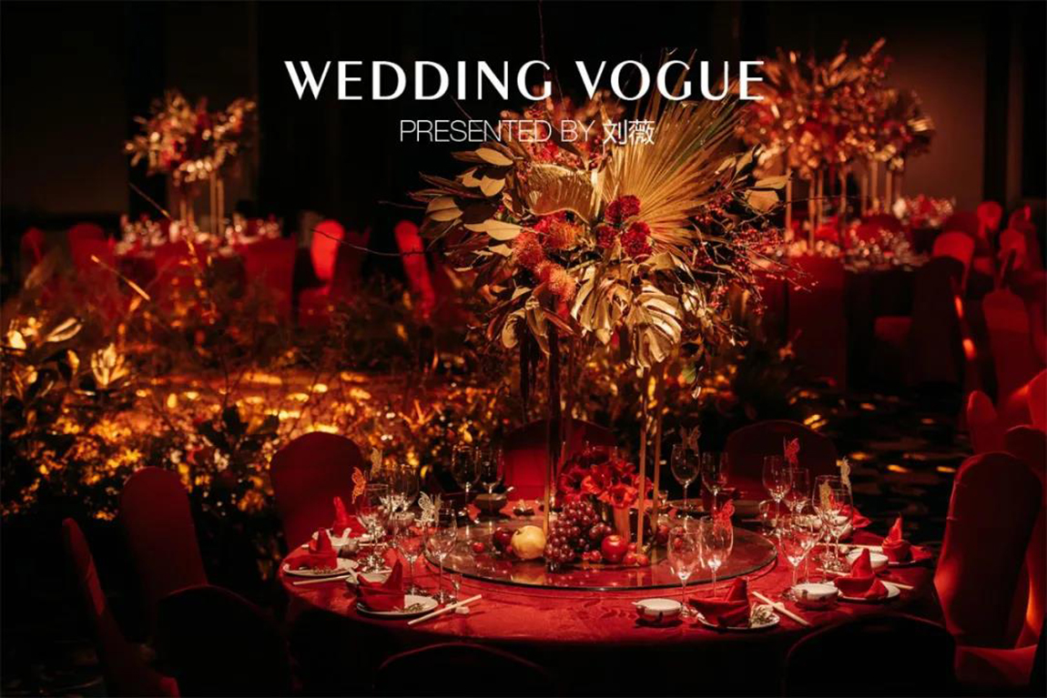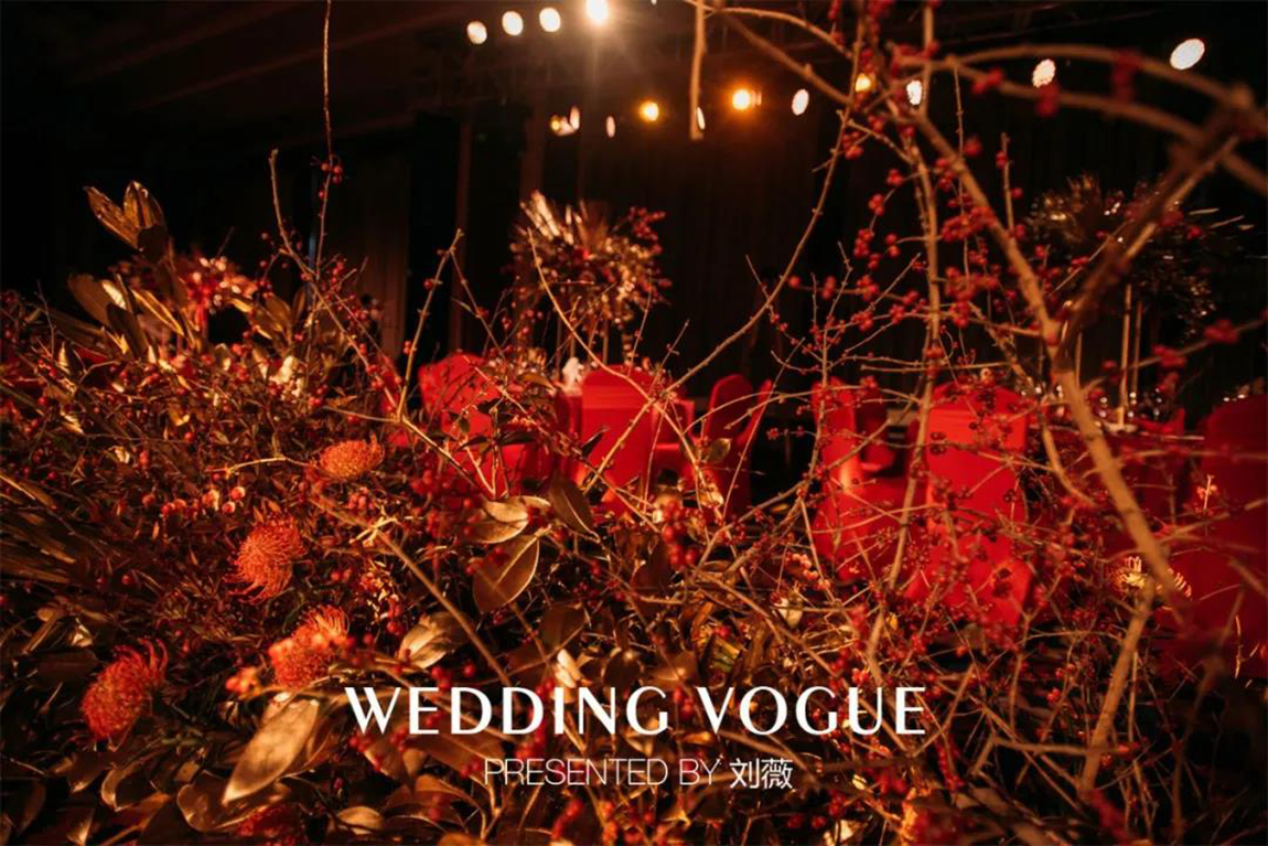 现场的花艺设计,红色稀有花材搭配金色的散叶材,细节处还有累累硕果,这一设计所代表的成熟与收获正是一对金婚艺术伉俪的生活写照。