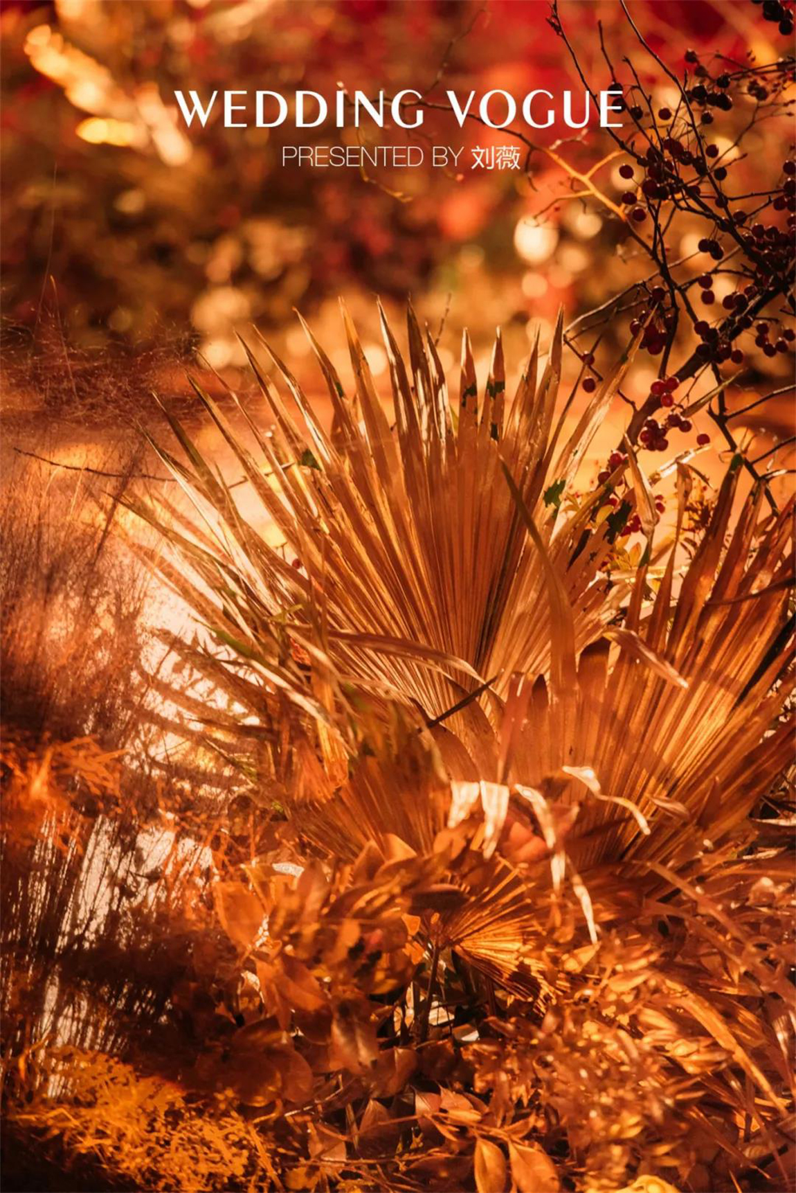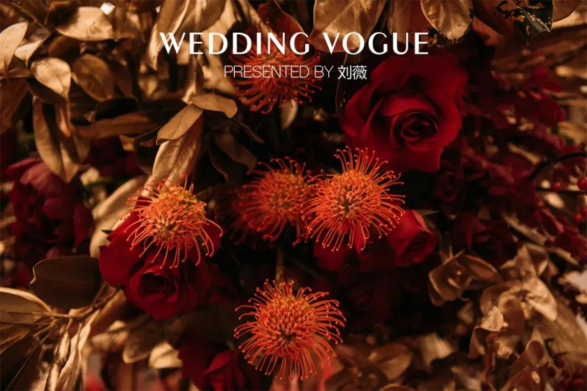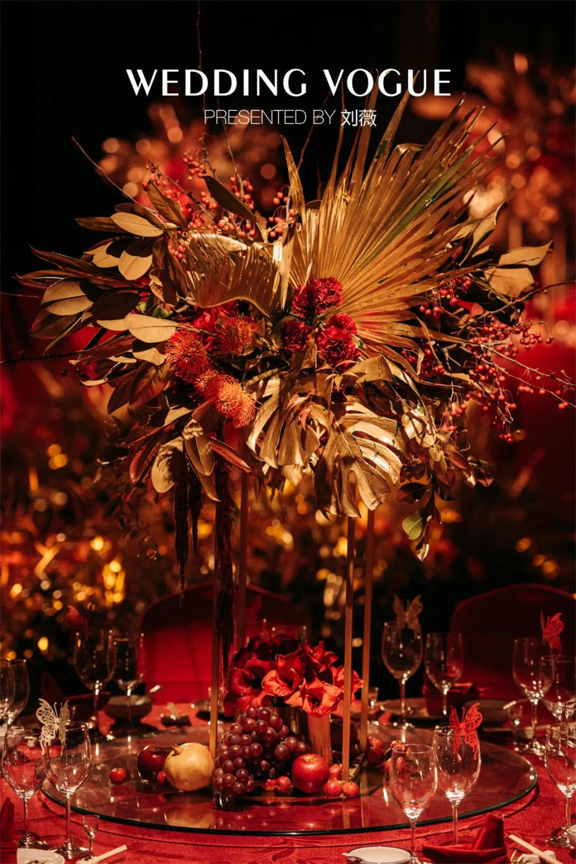现场的花艺设计,红色稀有花材搭配金色的散叶材,细节处还有累累硕果,这一设计所代表的成熟与收获正是一对金婚艺术伉俪的生活写照。