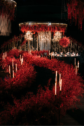 日期:2023-03-07 图文提供/Lomo岚茉婚礼酒红与墨绿的经典搭配,再加上藤蔓般的造型灯和丝绒质感的花艺,无一处不透露着设计感