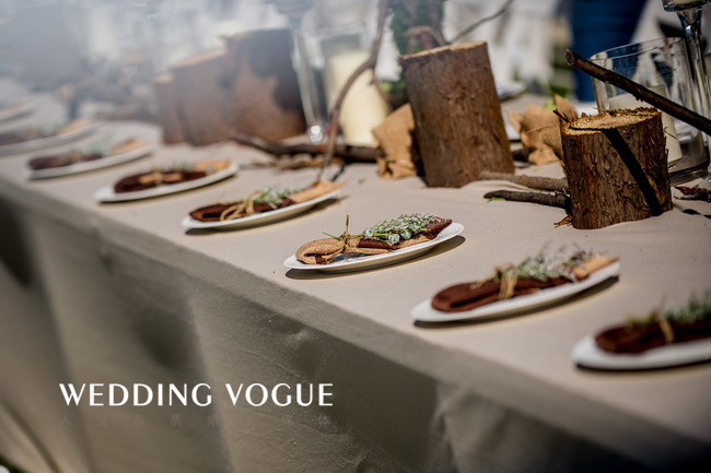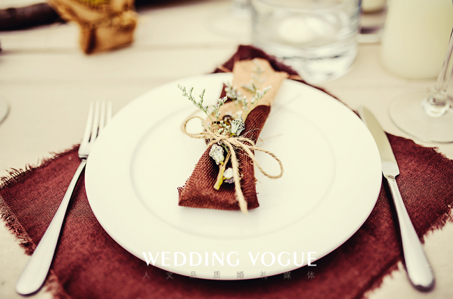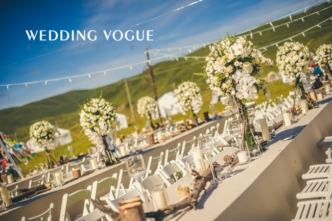 草原婚礼以蓝天草地为自然背景,不需要太多花哨的点缀,木桩与鲜花缠绕的拱形门搭建的简单独特,长桌的宴席布置既美观又方便,座椅采用白色木质,与绿色草坪的色彩搭配鲜明,方桌上的饰物也充分体现大自然的淳朴,原生态的树枝、树墩与清新的花卉相映成趣。