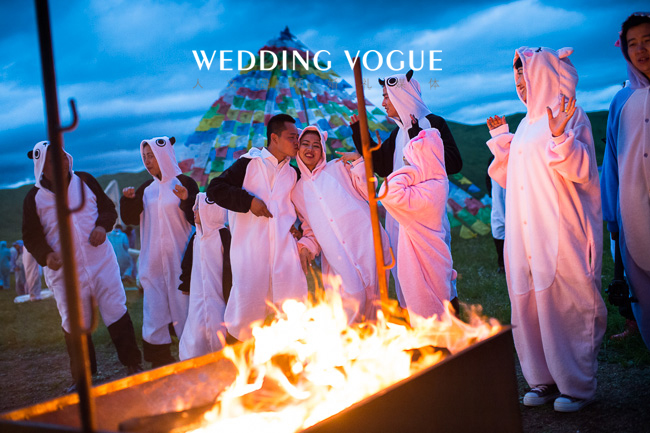 草原婚礼必然是全民狂欢的好时机,篝火晚会是必不可少的特色环节,当夜幕降临,大家都换上了轻松自在的动物家居服,在闪烁的霓虹灯下,围着篝火各种扮萌、各种畅饮,流露出的都是内心最真实的那份喜悦和祝福。