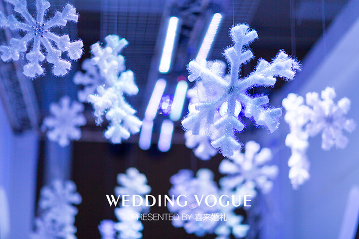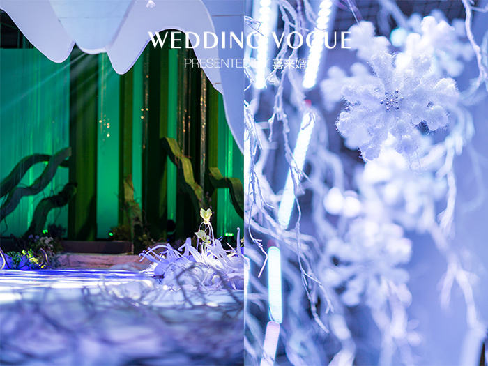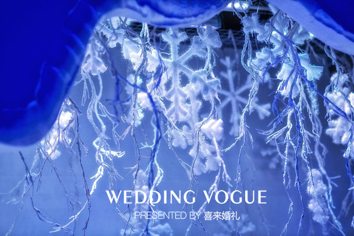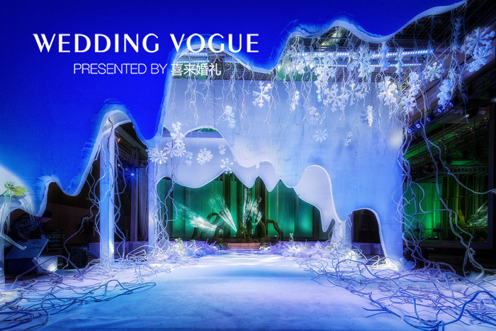 依照这样的设想,我们将宴会现场的布置设计为寒冬、暖春;冰雪覆盖、盎然生机这样两种看似对立、毫无关联的现场效果。而我们将寒冬的布景作为前景,暖春的布景作为后景,这样的设计用意在于,当各位刚刚步入宴会厅时,首先映入眼帘的是冰雪、萧条的场景,沉寂、冰冷、毫无生气是我们想要呈现的第一效果,这就好比我们在生活中的一种消极的状态,它像是一道道寒流划过我们的心房,让我们感到孤独、寂寞和伤感;现场特意采用了干冰和冷风,来配合营造连呼吸都显得冰冷的氛围。
