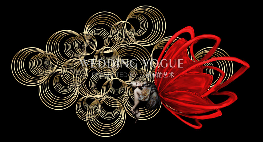 “破茧成蝶”诠释了敢于突破自我的中国新娘,完全跳脱出传统中式风格。设计上,运用了虚实结合手法,抽象地表达“破茧成蝶”这个概念,运用硬质的圆环材质,可动可静,诠释成长过程中遇到的困难和阻碍。当抽象的圆环旋转起来,搭配具象的红色蝴蝶翼,预示冲破险阻,完美表达中国新娘蜕变的惊艳。