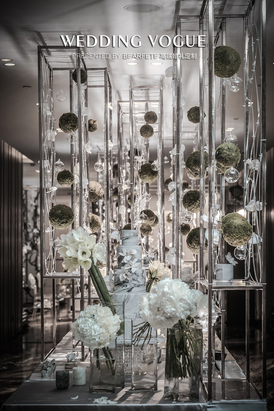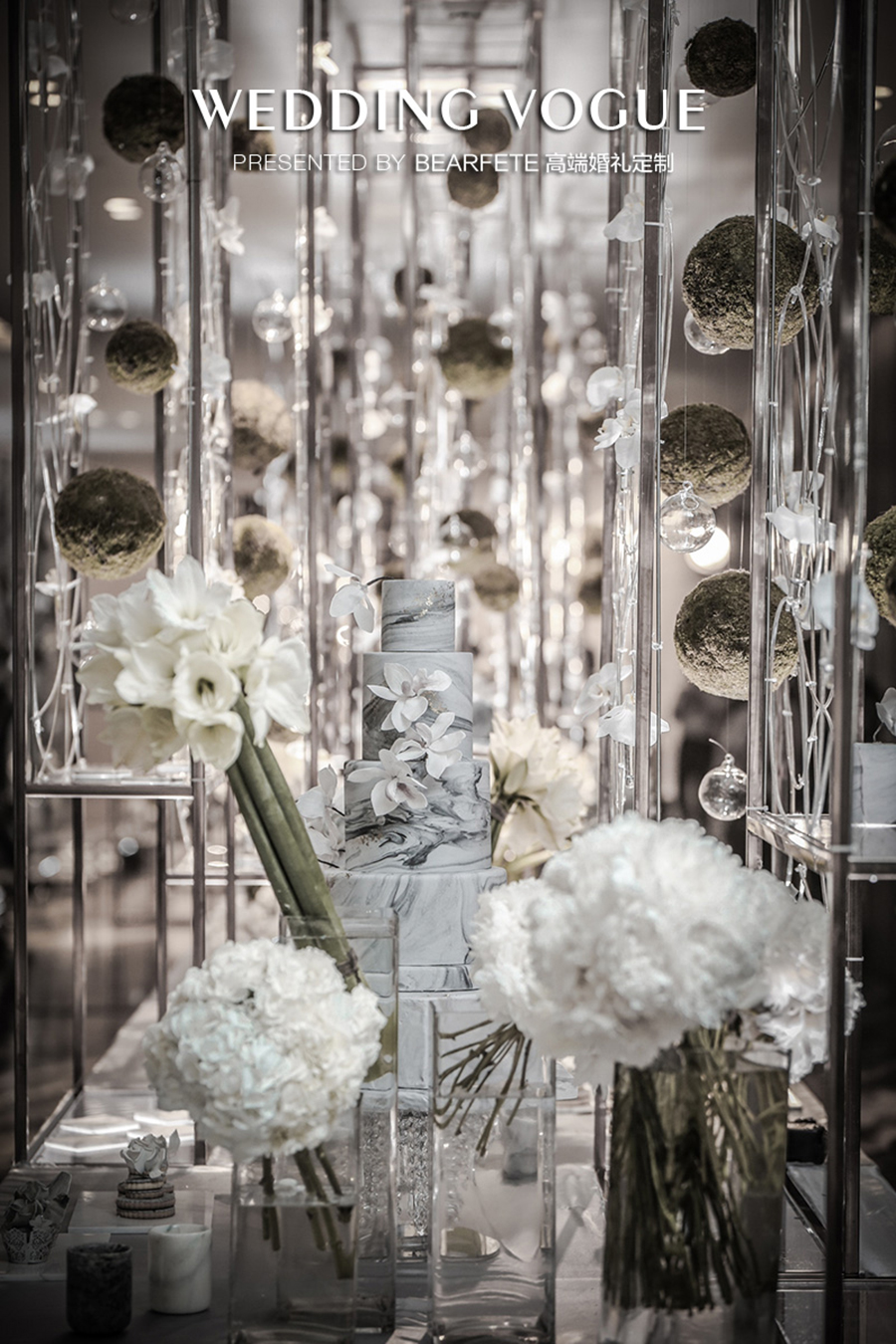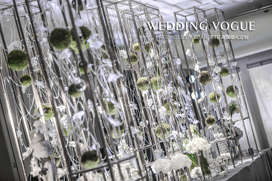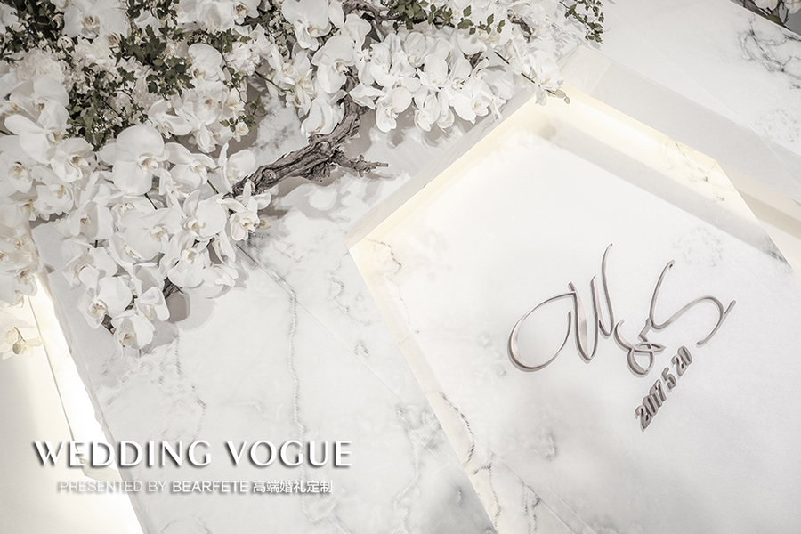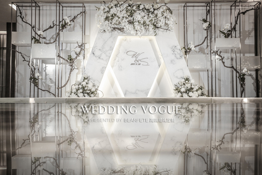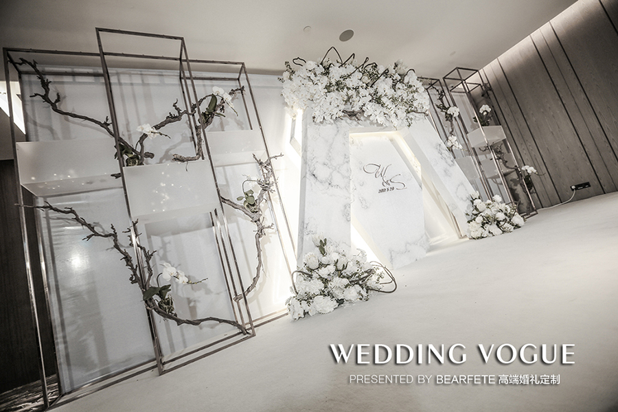 几何线条和中式花艺风格,配上大理石纹理的设计基调一直贯穿全场。可能大部分婚礼公司一直在说细节的处理,但在BEARFETE 高端婚礼定制看来,重要的是质感处理。大理石纹理用了有触碰感的布材质处理,矩形结构用了磨砂材质,里面更是放上星星点点的灯饰......种种细腻处理方能成就融入其中的视觉体验。
