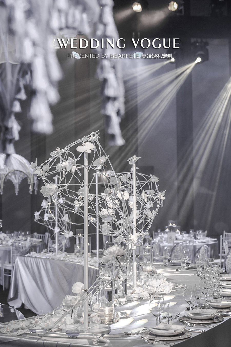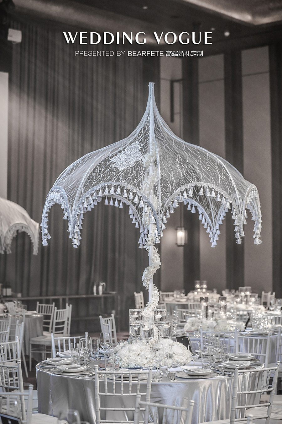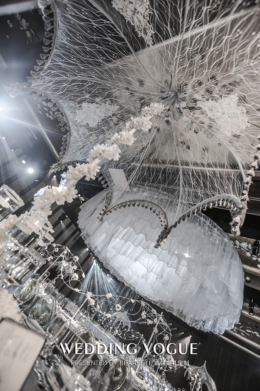 主桌花的设计更强调几何线条的运用,整体感觉简约现代,除此之外,引人注目的是极具西式特色的欧洲宫廷伞型,上面均为手工定制蕾丝。这样一种西式风格,却是作为圆桌的中心布置,“形”在西式,“神”却在中式,颇有意味。