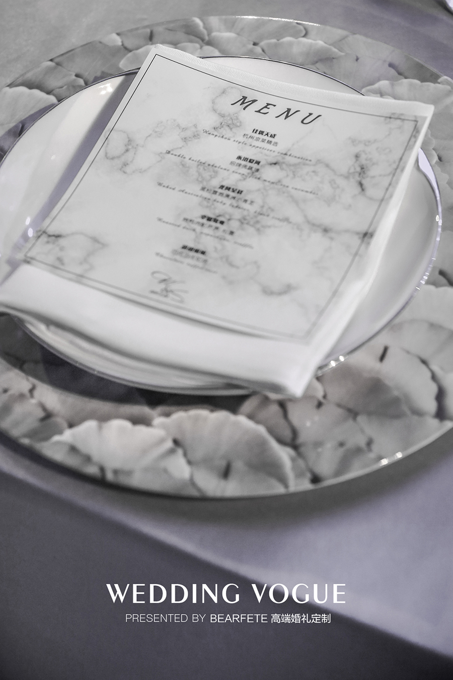 酒店的整体设计低调素雅、线条简约、装置风格结合了中西方两种文化,细节处比如餐盘等有精致的大理石纹理......因地制宜,婚礼设计在这个基础上延伸,成为这场婚礼设计的主方向。