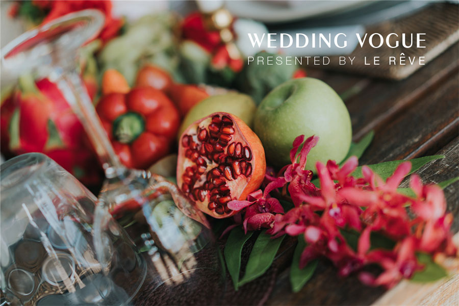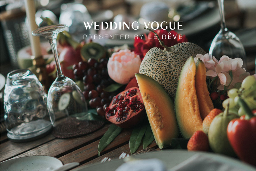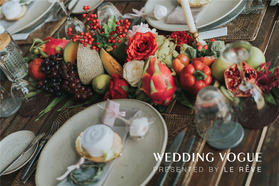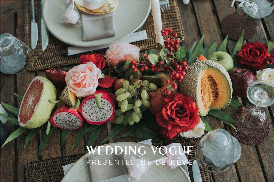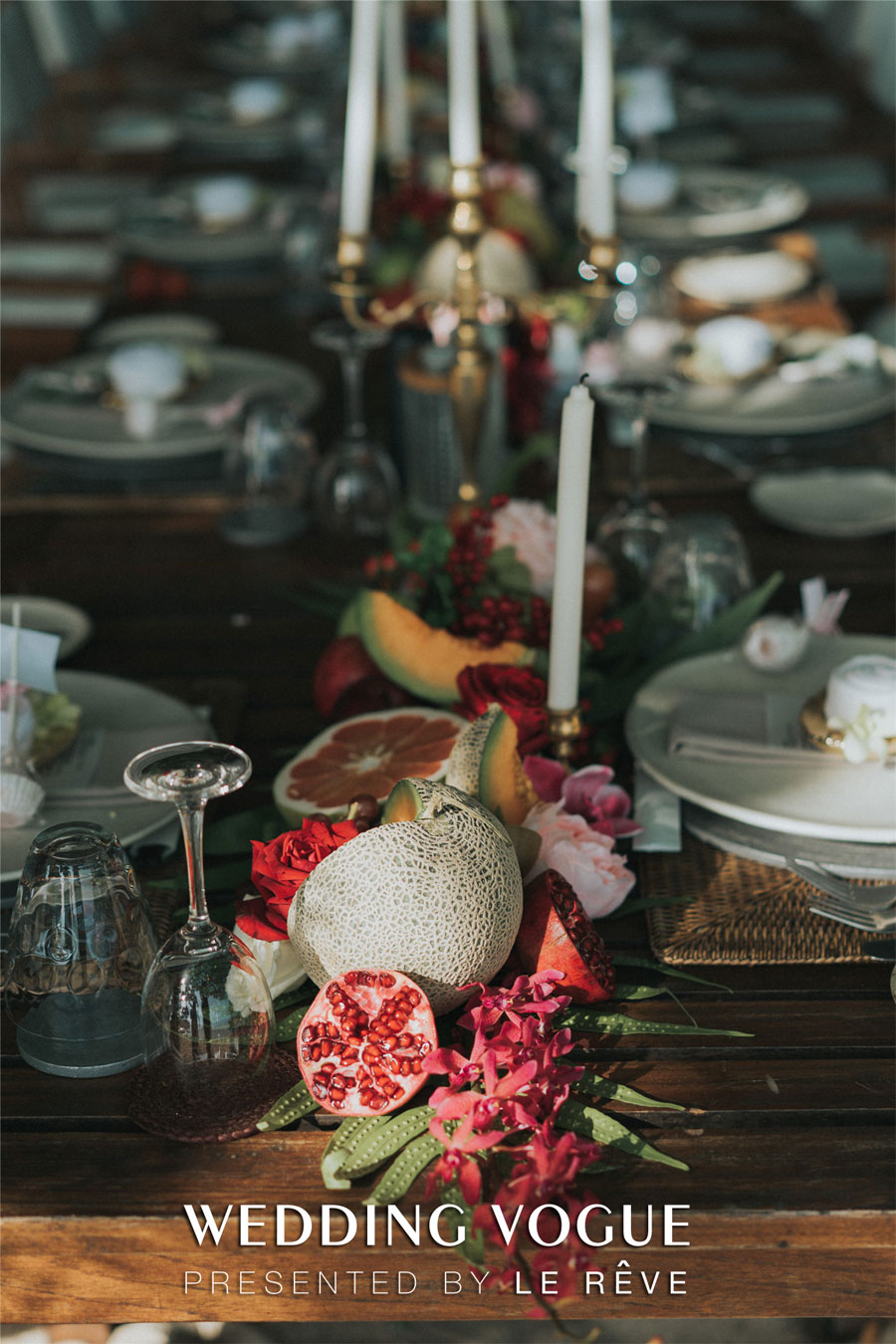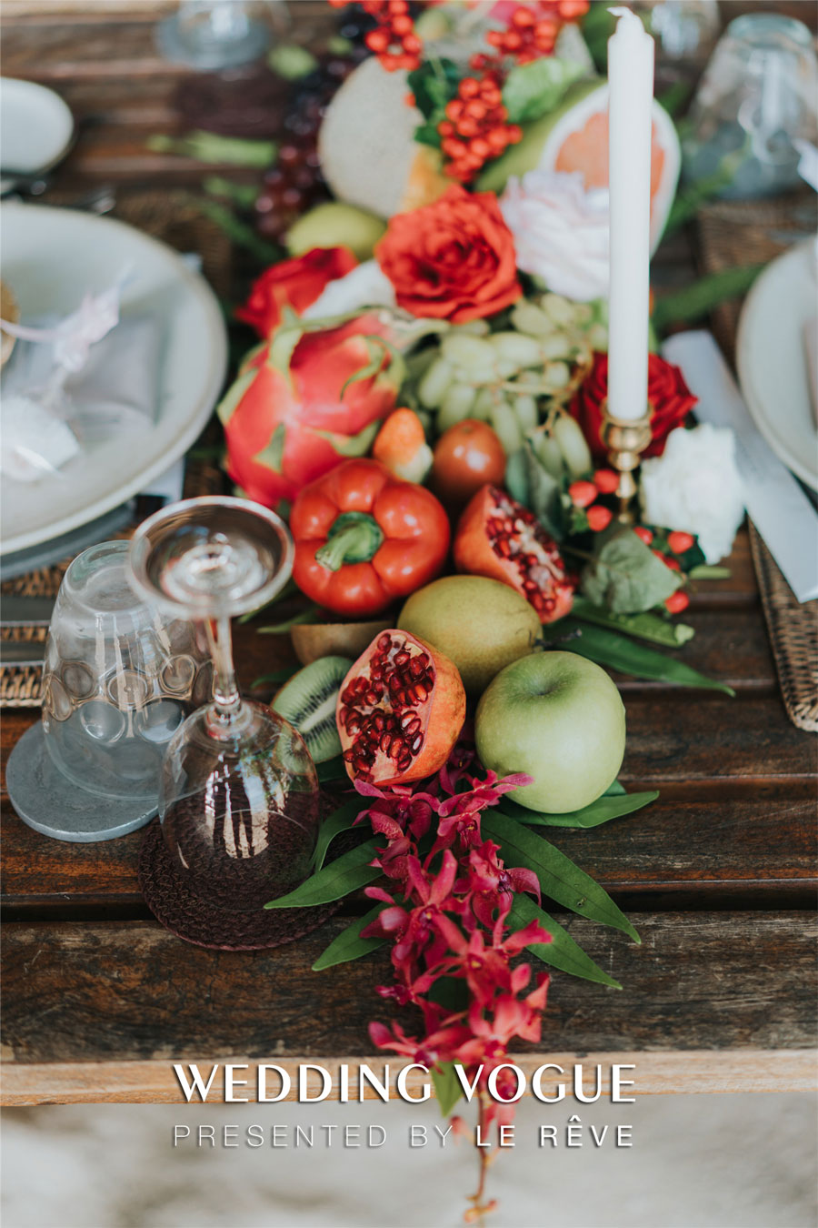 这个小岛临近的甲米镇并没有鲜花供应商,如果完全仰赖鲜花的设计,就意味着成本的不必要消耗,而直接采用当地就有的富饶水果,比如石榴,火龙果,苹果,哈密瓜等等,多样的水果品种以及丰富的水果纹理,与辅助设计却能营造极佳的效果。