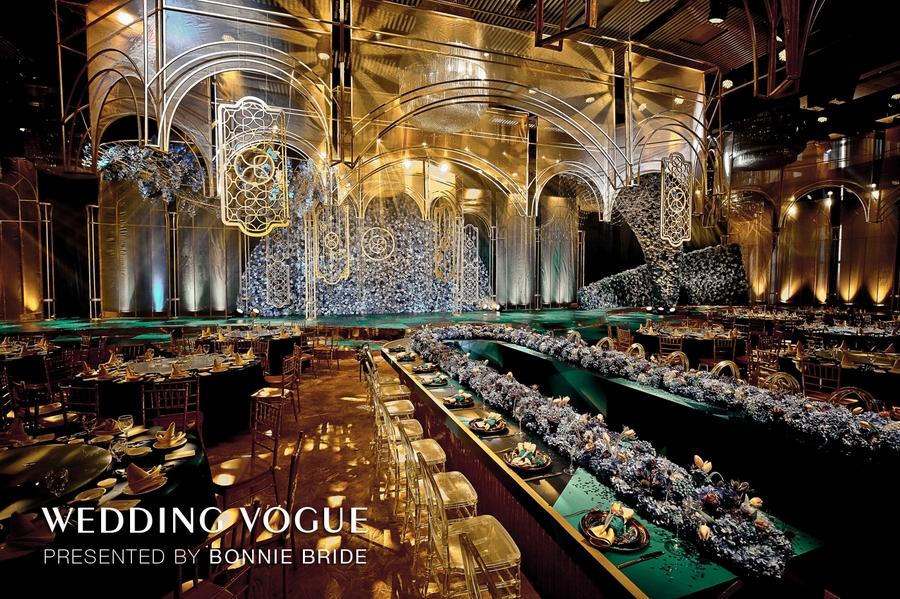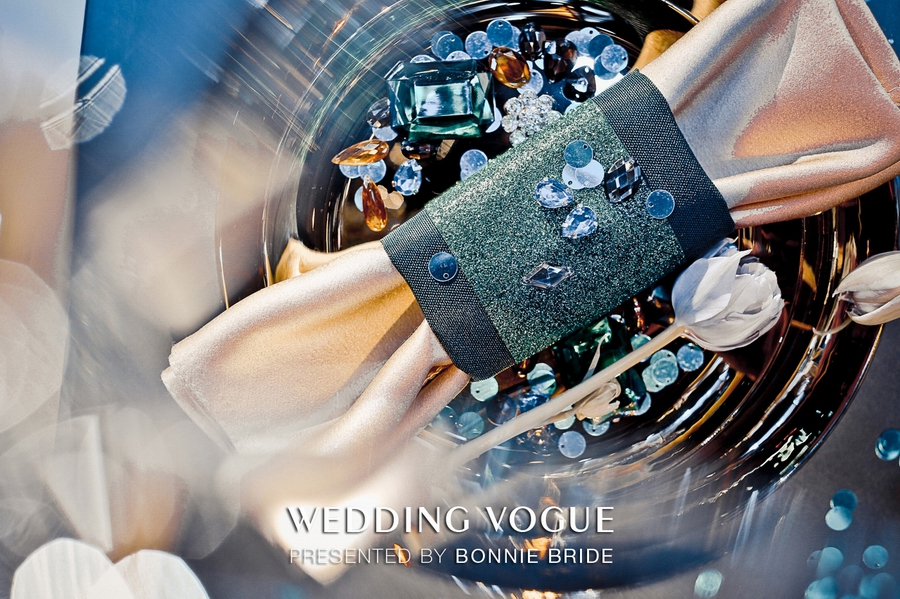 同时也因为新娘喜欢blingbling的元素,设计师便依构思将闪烁的细节布置于空中,并在都不怎么会引人注意的桌身之上放满闪耀的捷克水晶。当大面积的通透材质,在灯光的渲染下营造出了别致且渐进的透视质感,现场的每个空间都能透过多层次的镂空、璀璨的灯饰来传递出奢华闪耀的细节要求。