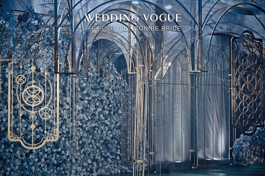 宴会厅内部的主舞台被设计师设计成了不规则的弧线形状,在摒弃了传统的T台造型后,原本应该放置T台的区域,在当天摆放了U形的定制长条桌,而其他区域则安排了传统的圆桌。