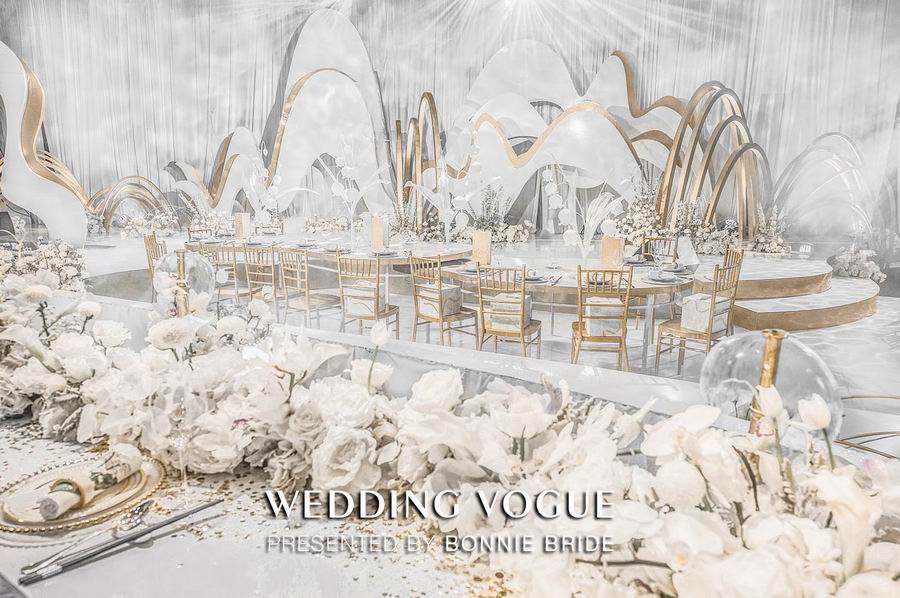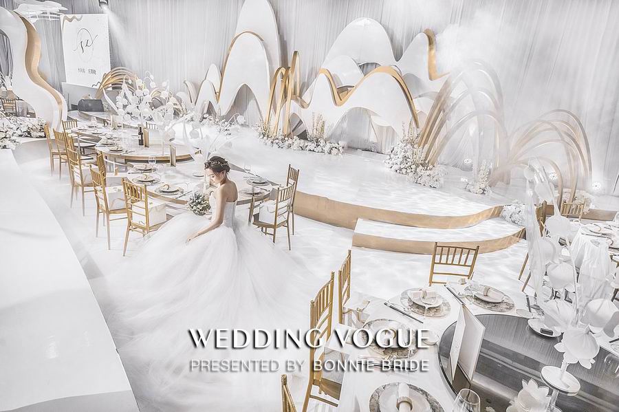 在仪式区中,伯妮并没有设置传统的T台,一改常规的仪式区格局,整个宴会厅是一个完整的场景,就连餐桌的设置也是宴会区中的一景。