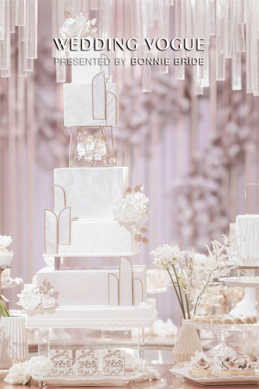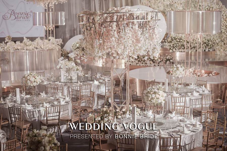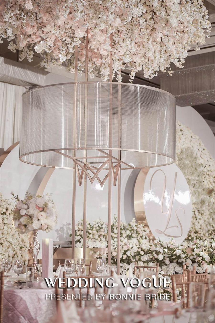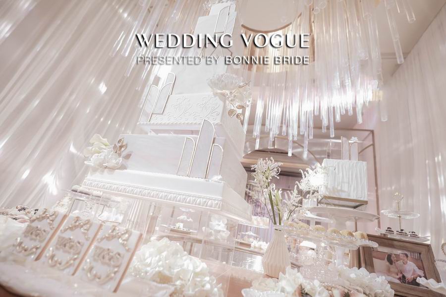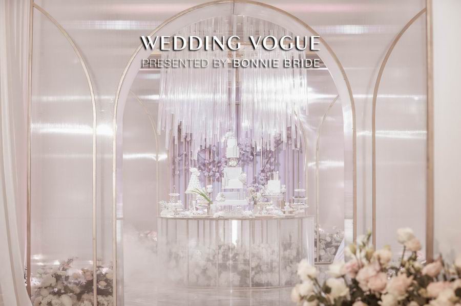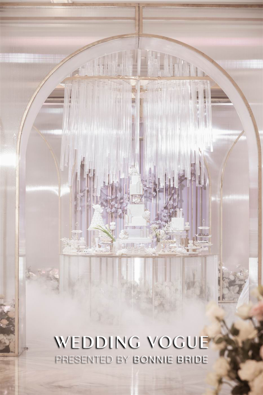 同时,传统的单板桌脚甜品台被圆形立柱取而代之,剔透的垂坠水晶管被悬空吊顶置于甜品桌上面,通过细腻的线条搭配反光透明材质,让光影的流动和雅致的冷色调共同营造静谧的现场氛围。