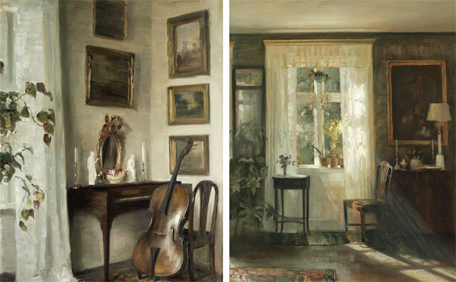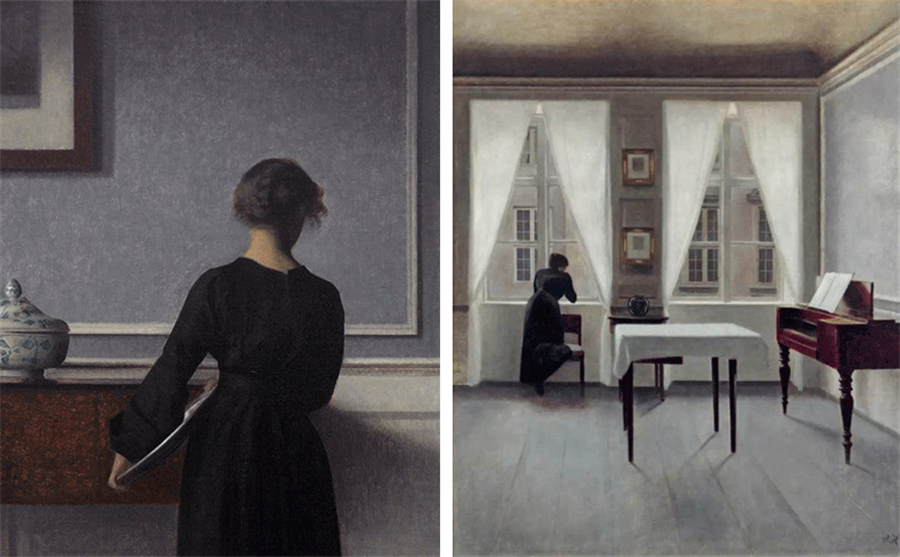 在整个画面中,虚拟的光线色彩,和大多以妻子艾达的背影或是自家某个角落等静物为主的作画对象相互制约,让静谧与雅致在视觉上达到了完美的平衡。而深藏这些画作背后的,则是哈默修伊以艺术之名,所追求的沉静如海一般的质朴与隽永。