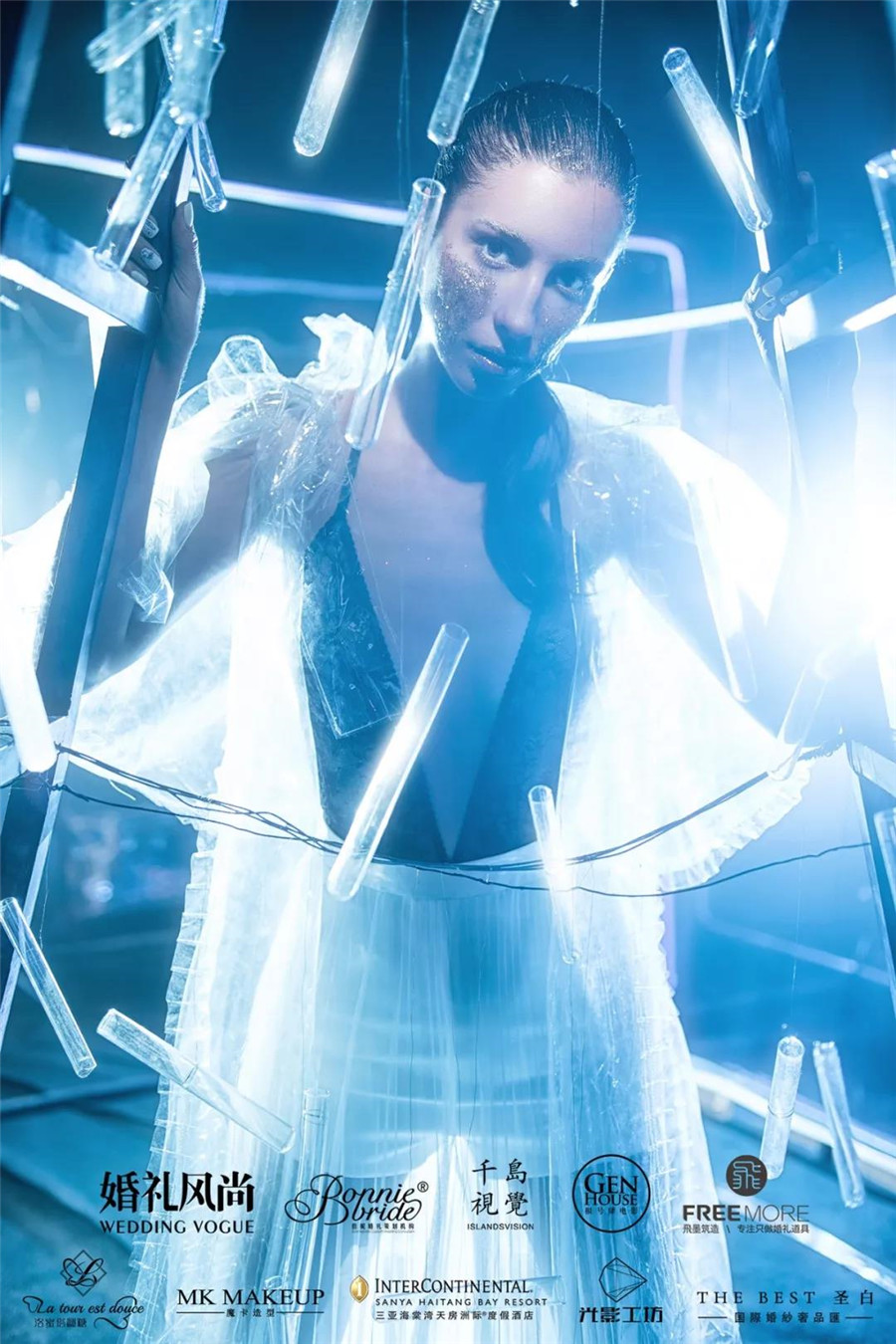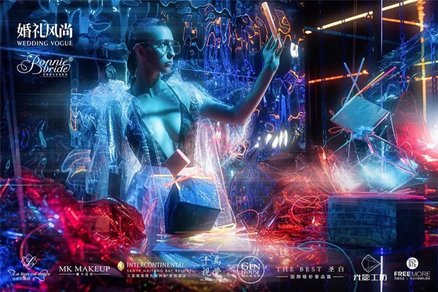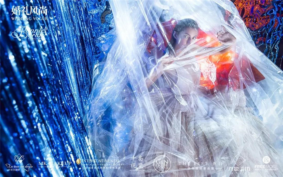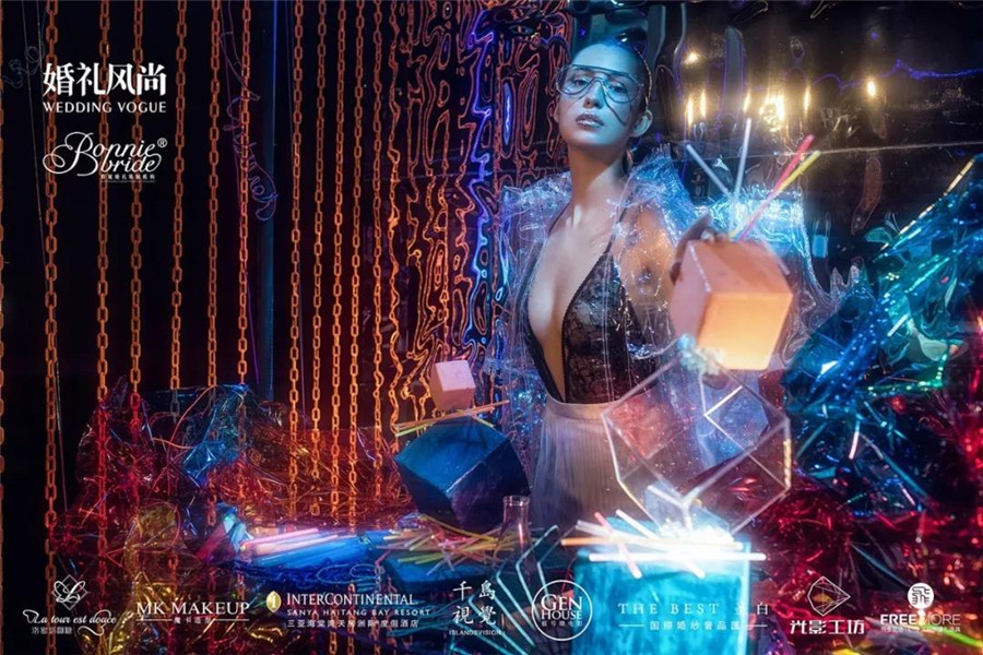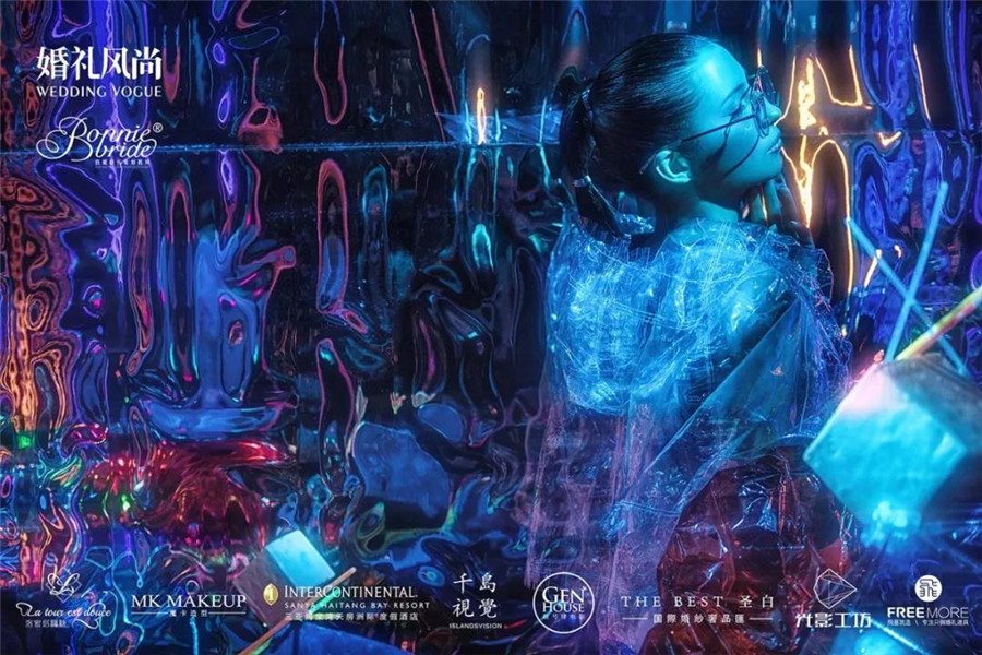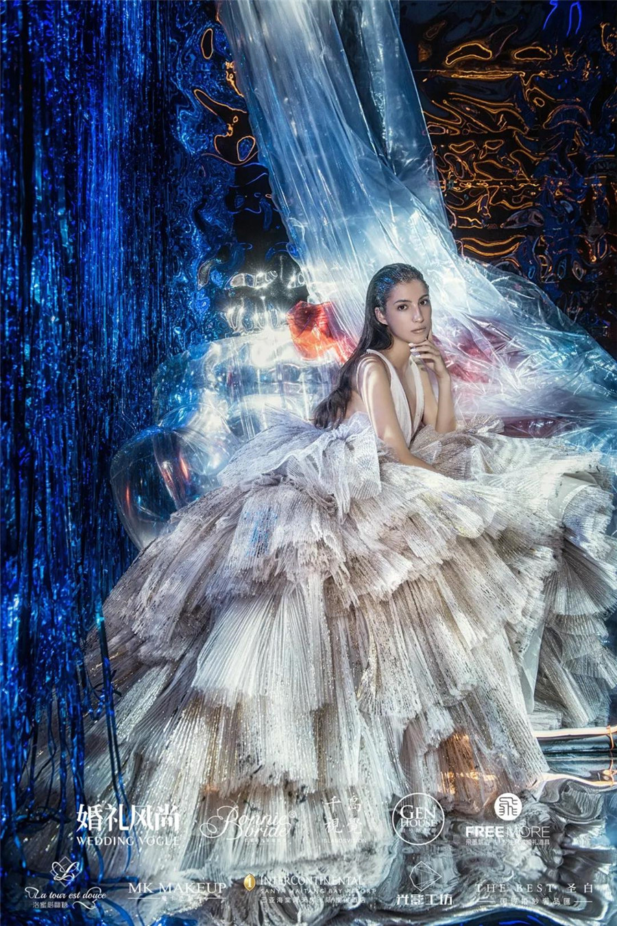 与众不同,不断突破,伯妮的探索从未停止。抛弃了传统婚礼使用的泡雕、喷绘等材料,在场景中大量运用了生活中可以见到的水管、链条、玻璃烧杯、雨衣膜、冷光线等材质,与交织映射的灯光搭配,营造出了极致的梦幻和酷炫之感。