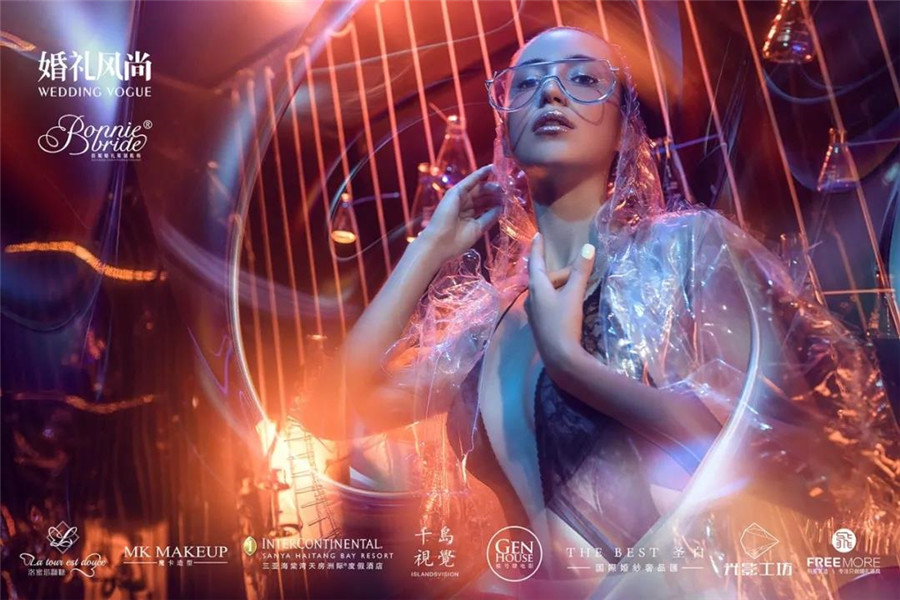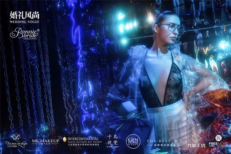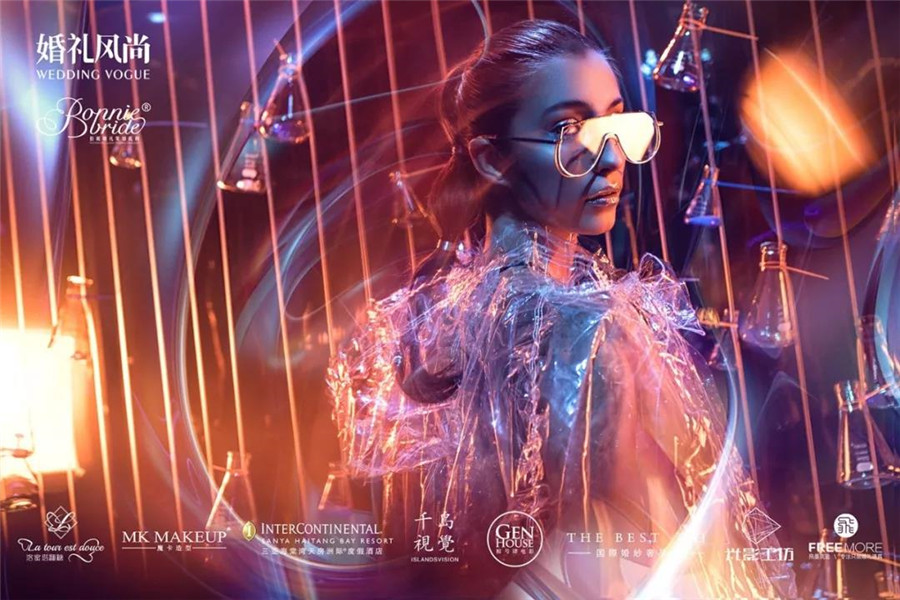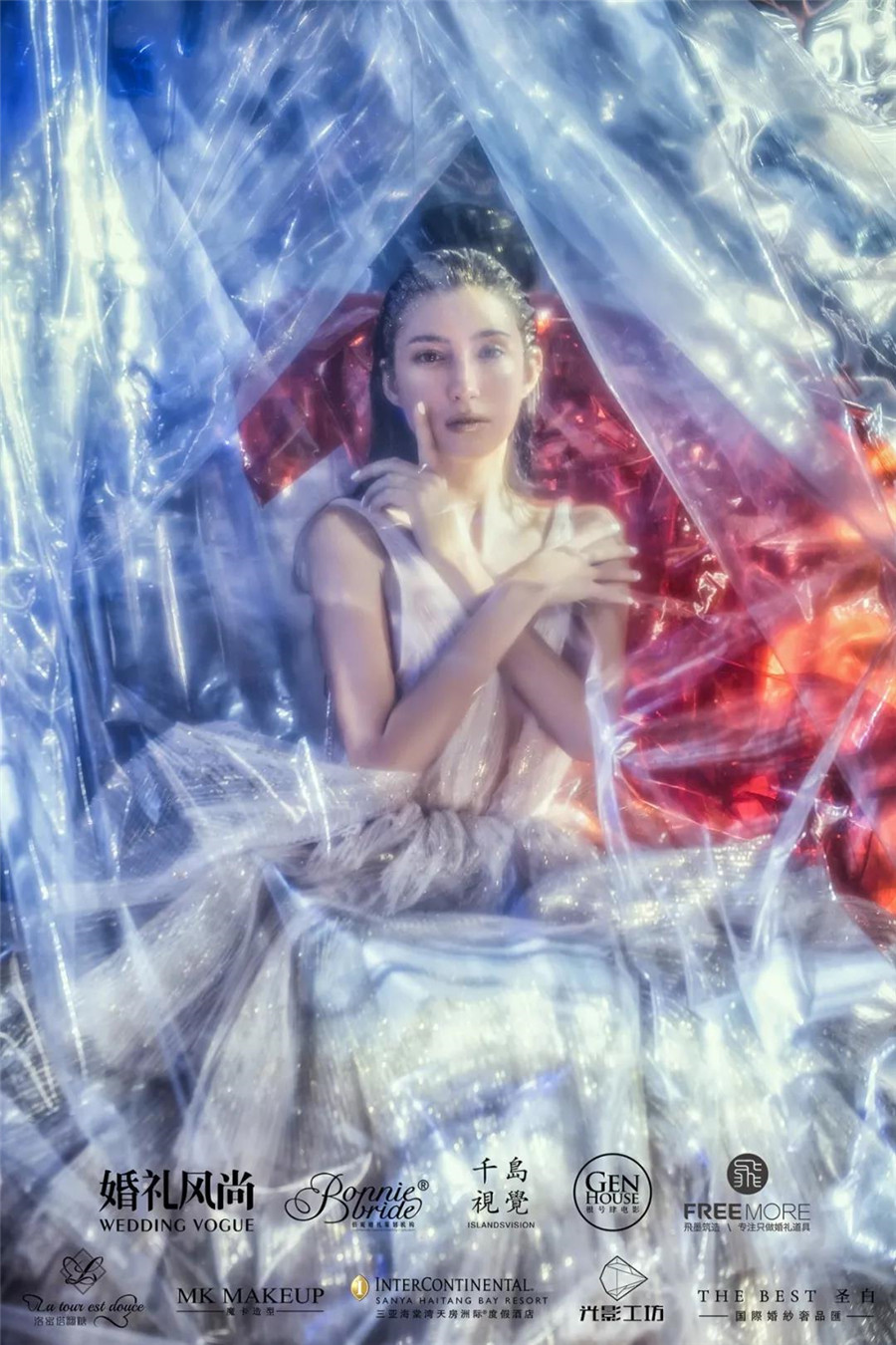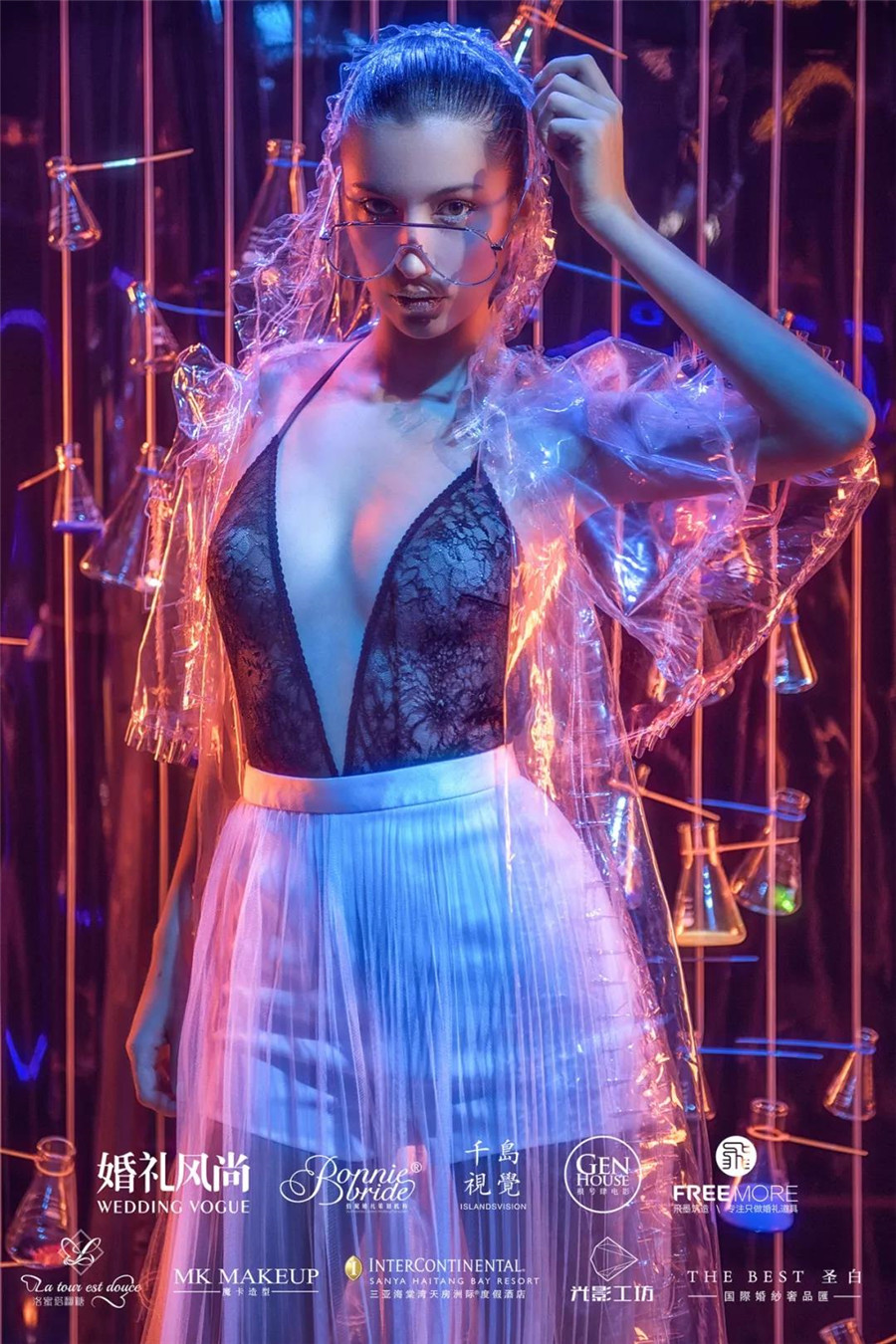 与众不同,不断突破,伯妮的探索从未停止。抛弃了传统婚礼使用的泡雕、喷绘等材料,在场景中大量运用了生活中可以见到的水管、链条、玻璃烧杯、雨衣膜、冷光线等材质,与交织映射的灯光搭配,营造出了极致的梦幻和酷炫之感。