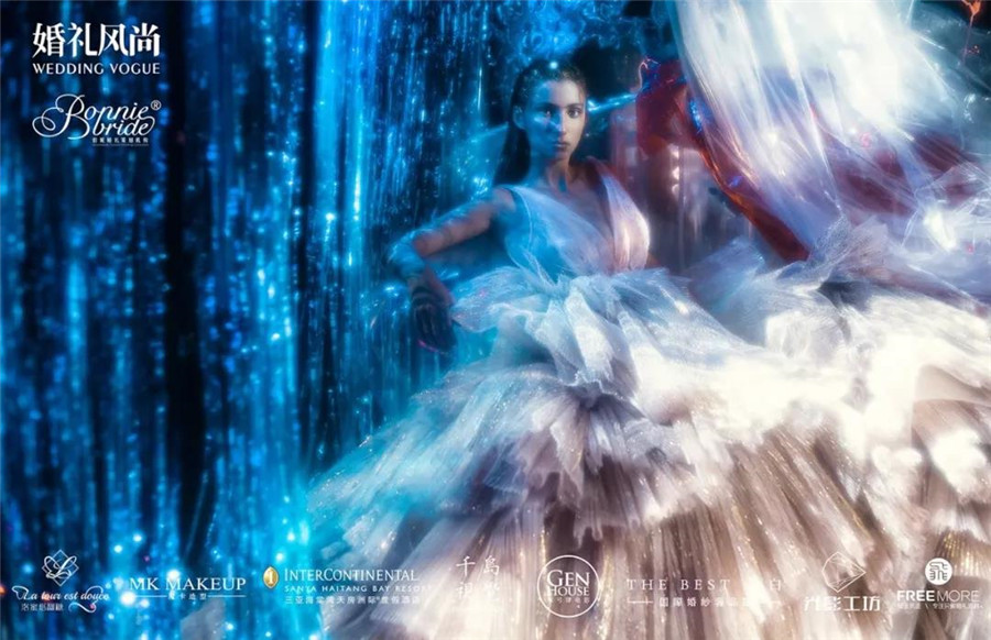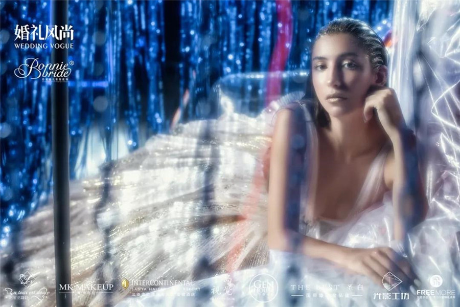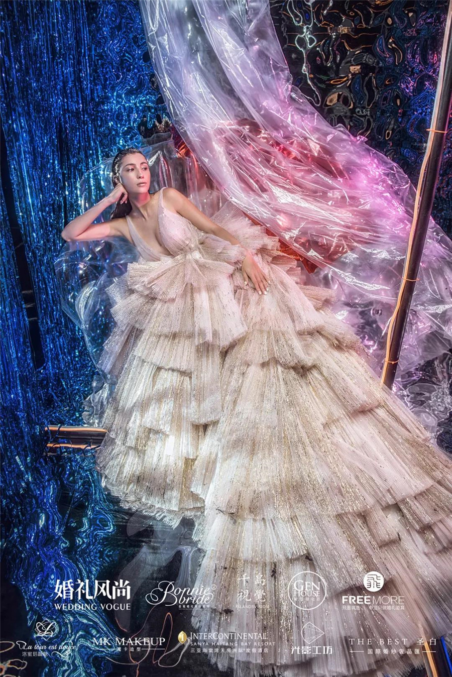 模特身着The Best 圣白国际婚纱礼服提供的来自意大利高定品牌PeterLangner的两套婚纱,立体简约的剪裁打造出经典风格,裙身闪耀着琥珀色的光芒,璀璨耀眼。