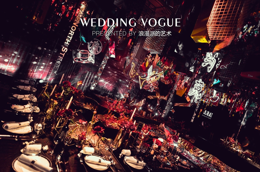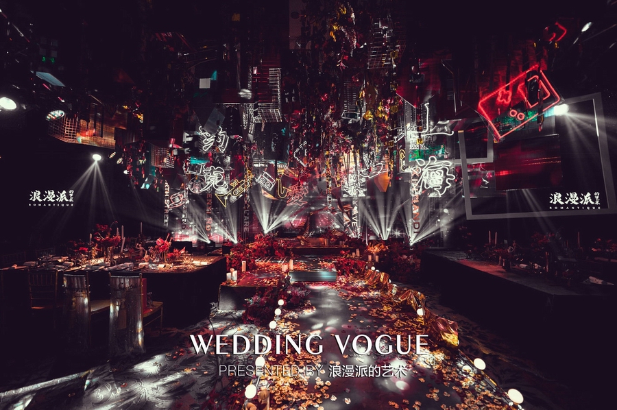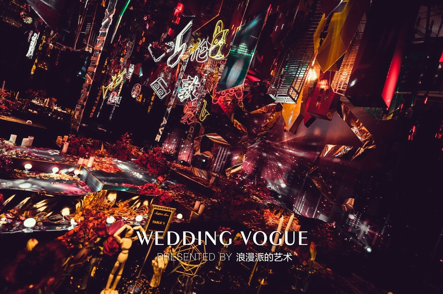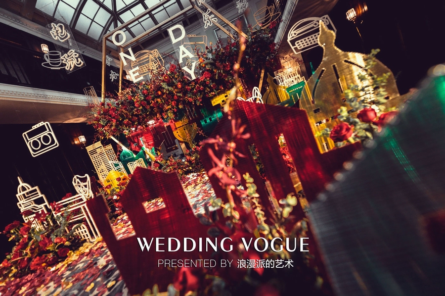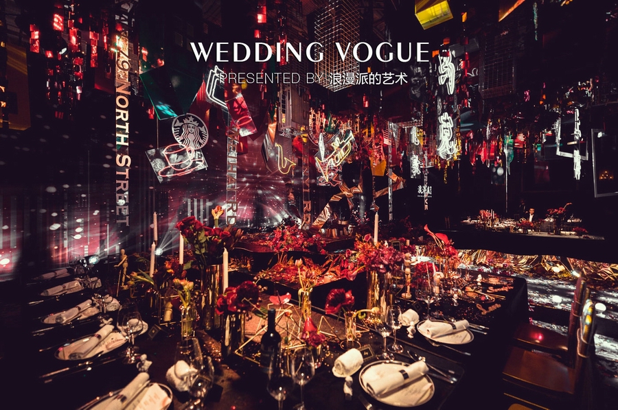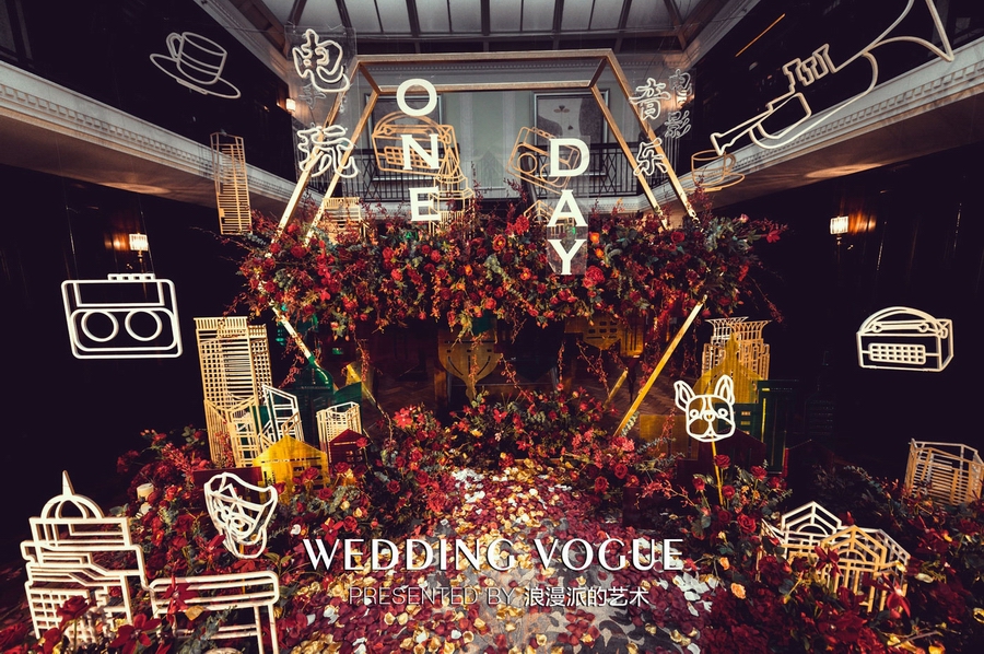 装点了大量霓虹灯的现场,再搭配上不同色彩的装饰物,灯光的变化让整个婚礼现场焕发出城市的夜色。像极了那个华灯初上,城市里到处流淌着灯红酒绿的老上海,恍然间好似回到了那个繁华张扬的大上海。