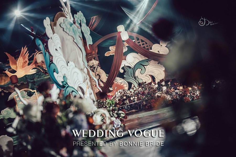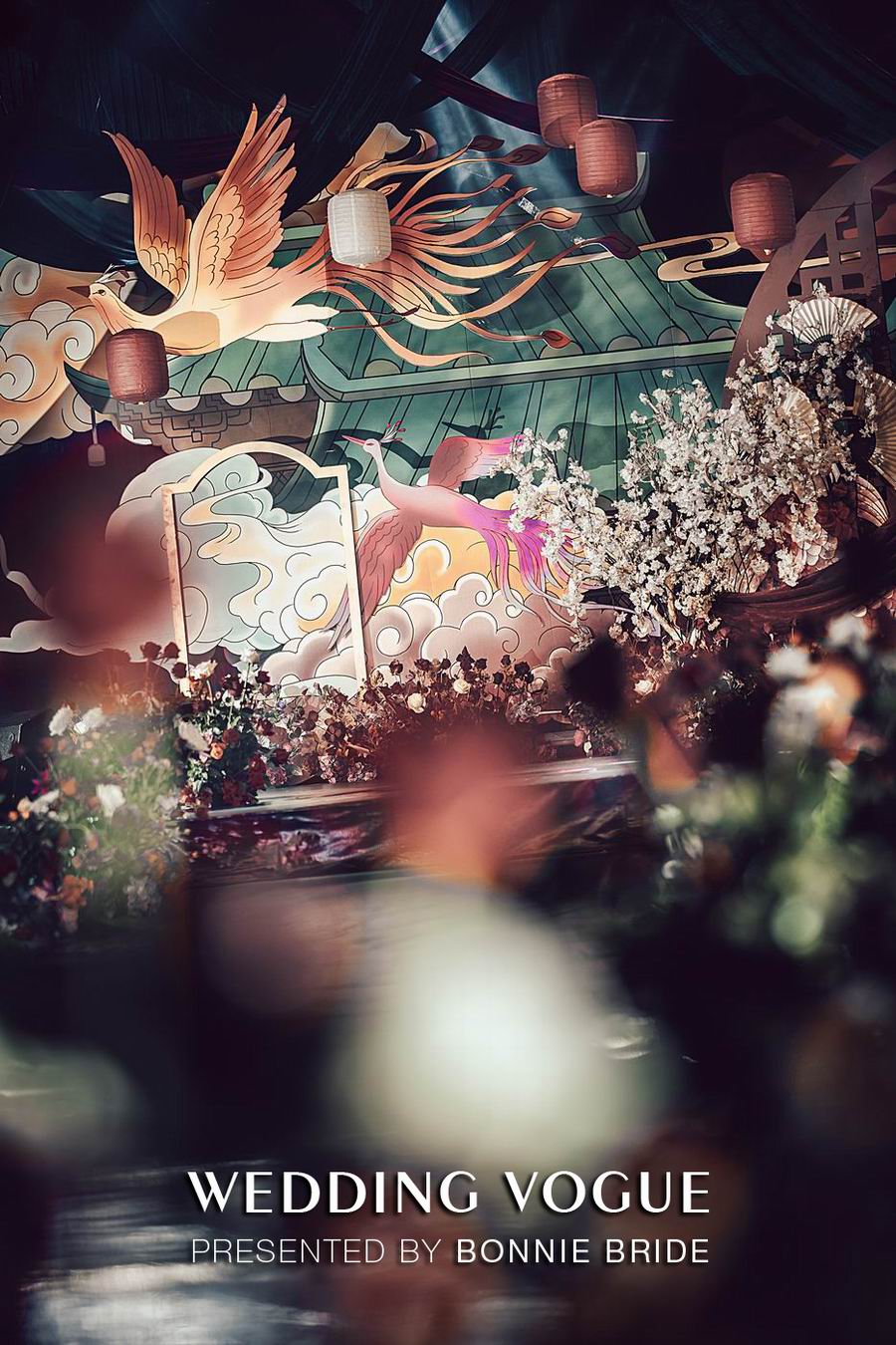 不仅在视觉呈现上大量参考了丰富的世界绘画艺术类型,将具有视觉冲击力的丰沛色彩运用到婚礼本身。还将整个现场设计成一个徐徐展开的画卷,用赤色楼宇、珍珠似的月光、闪耀的凤凰,描绘出了一片绮丽的东方幻境。