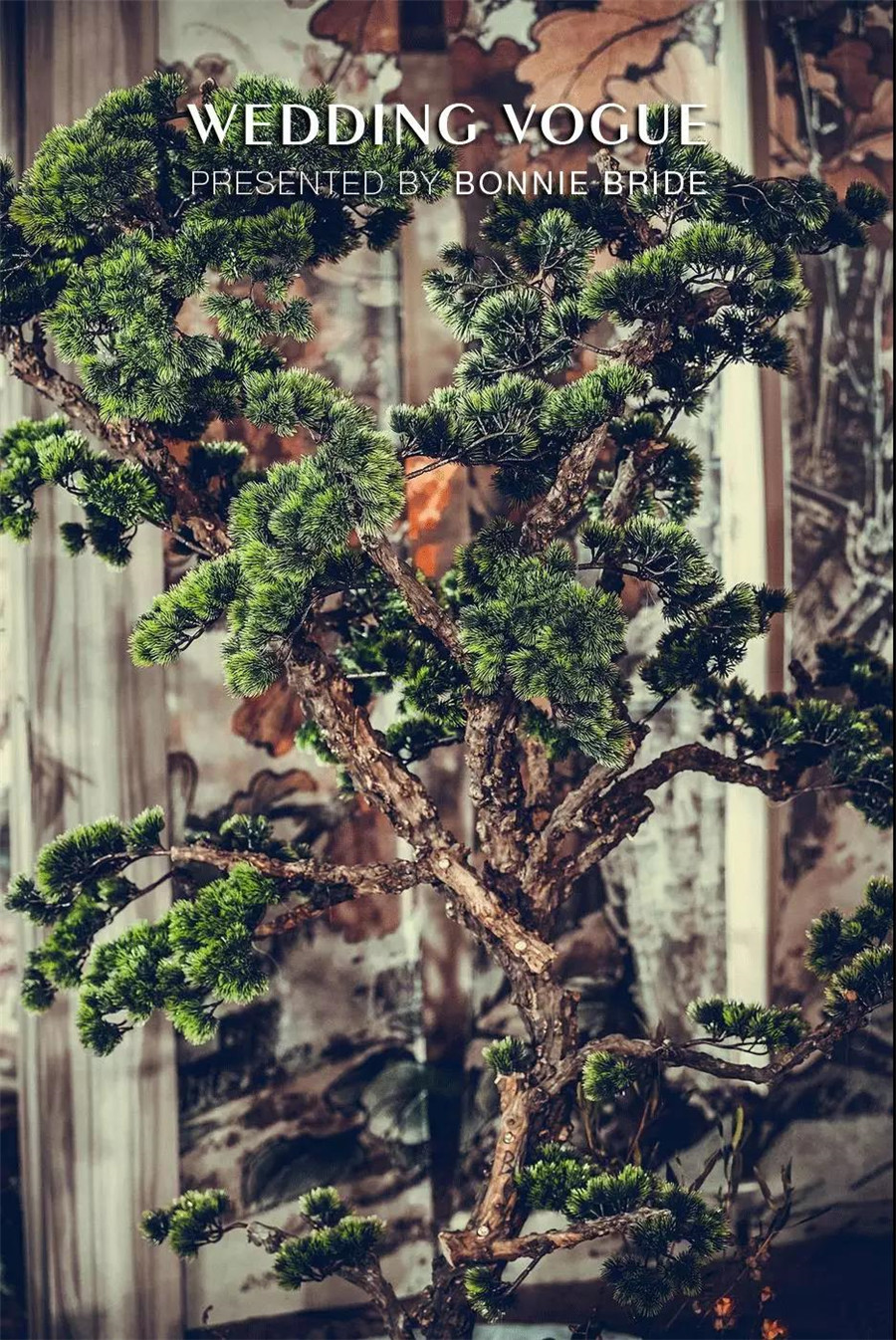 这次婚礼中的花艺植物,伯妮也按照日本园林的特点,尽量减少了繁复的品质,以松柏、竹,还有代表秋季特色的枫树为主景植物,少量的花艺作为点景植物,层次清楚,形式简洁。