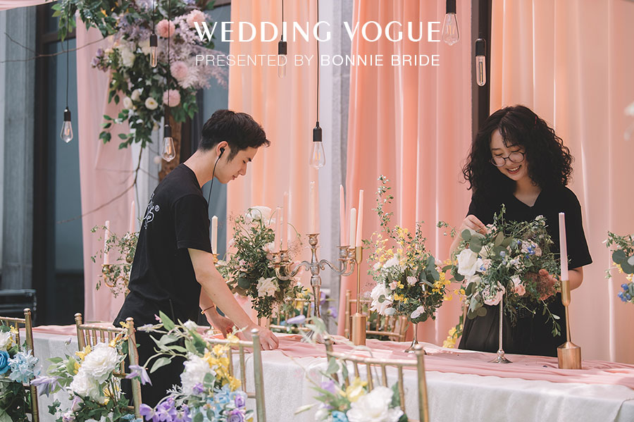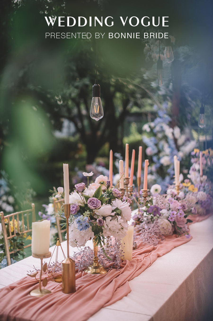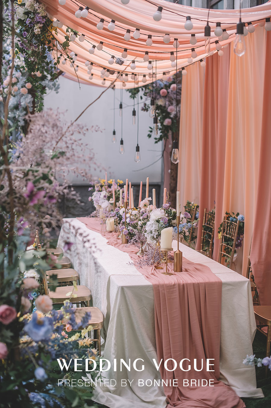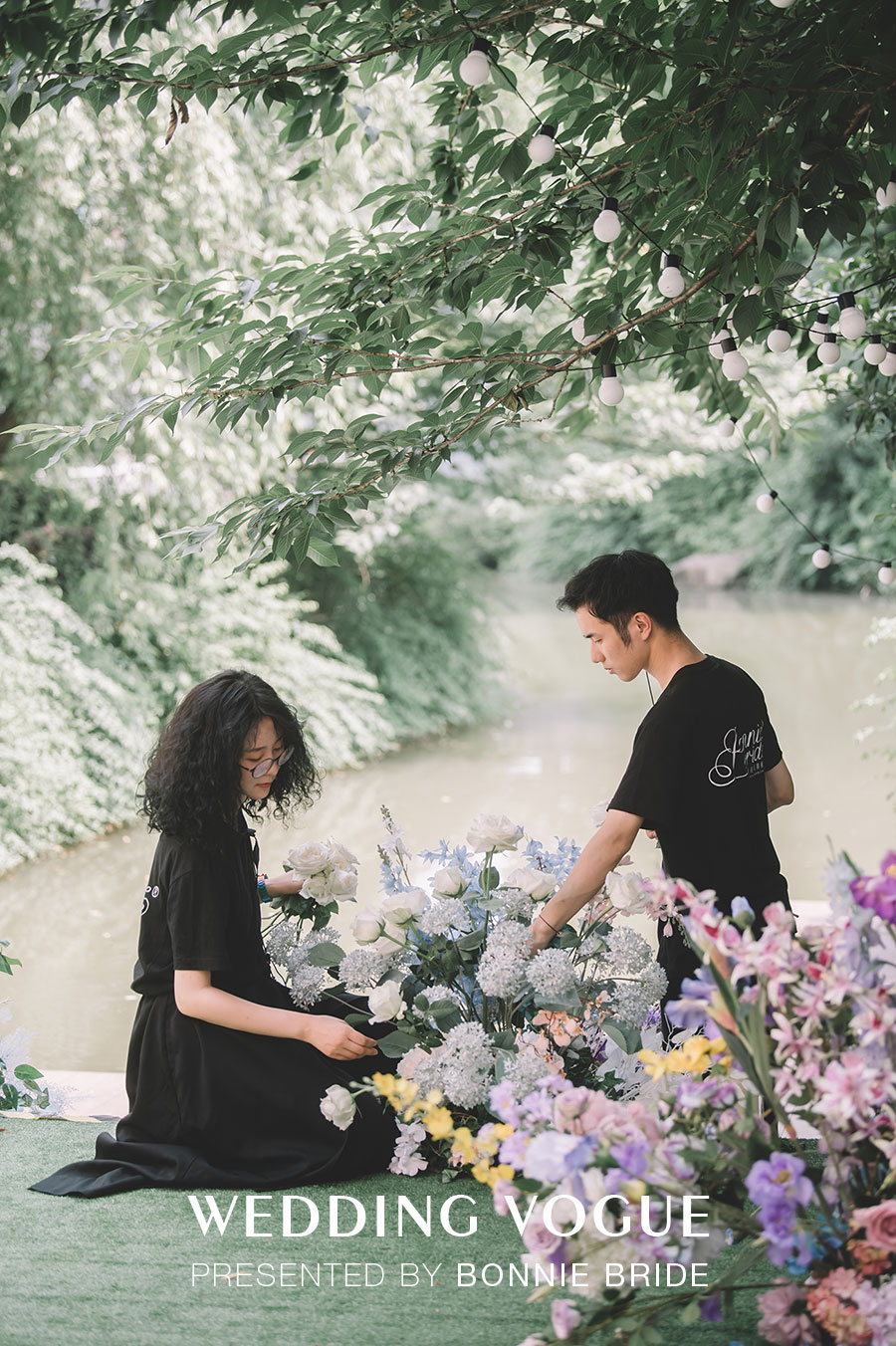 一片私密的莫奈花园,树影下,水台边,几位好朋友,布置的刚好的花草,桔梗流连于玫瑰,仙女灯坠入繁花,布幔摇曳,花香馥郁。