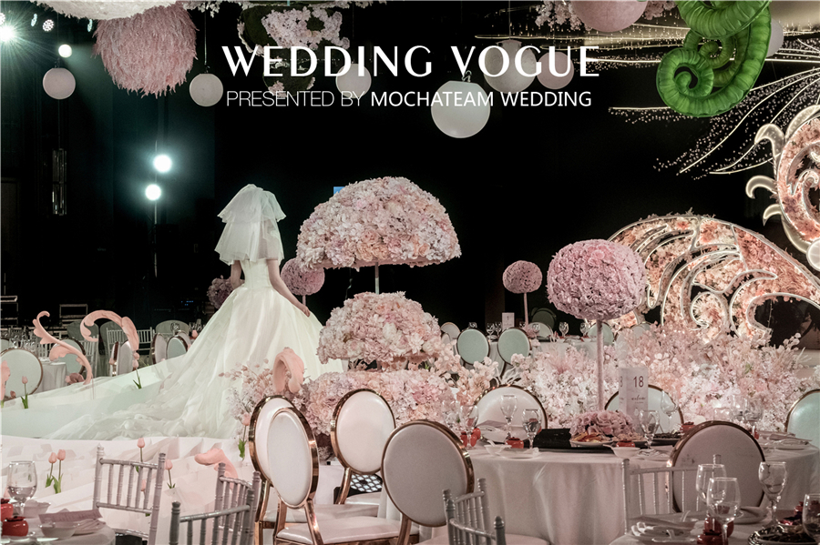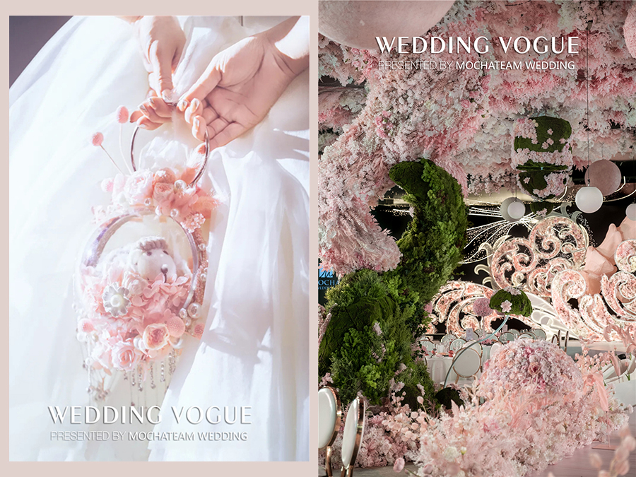 粉与绿的反差色打破了“梦没有颜色”的规则。强烈的色彩冲击,更能展现如梦似幻的视觉效果,也给庄重的婚礼添上了一丝活泼、轻松的调皮感。