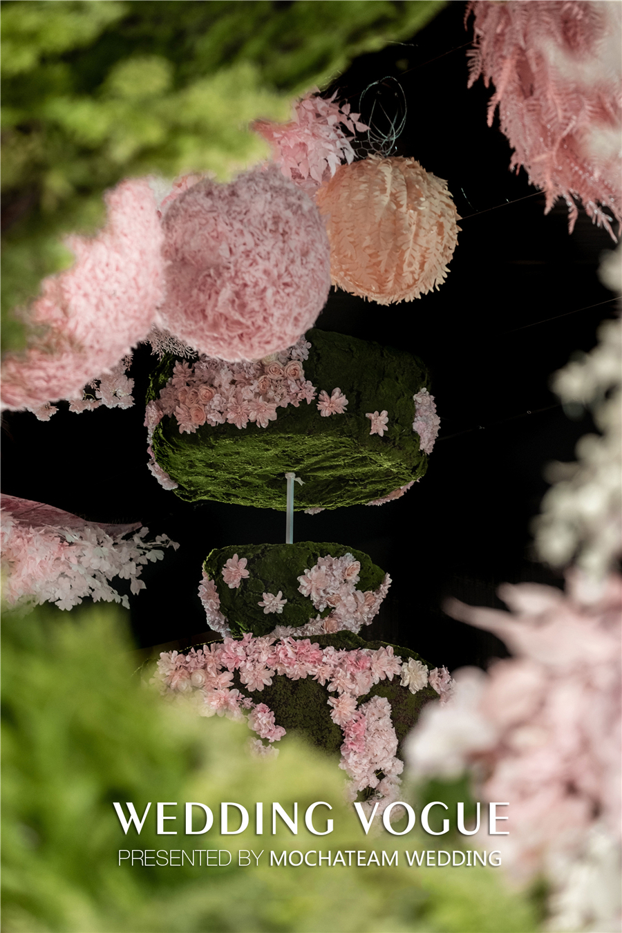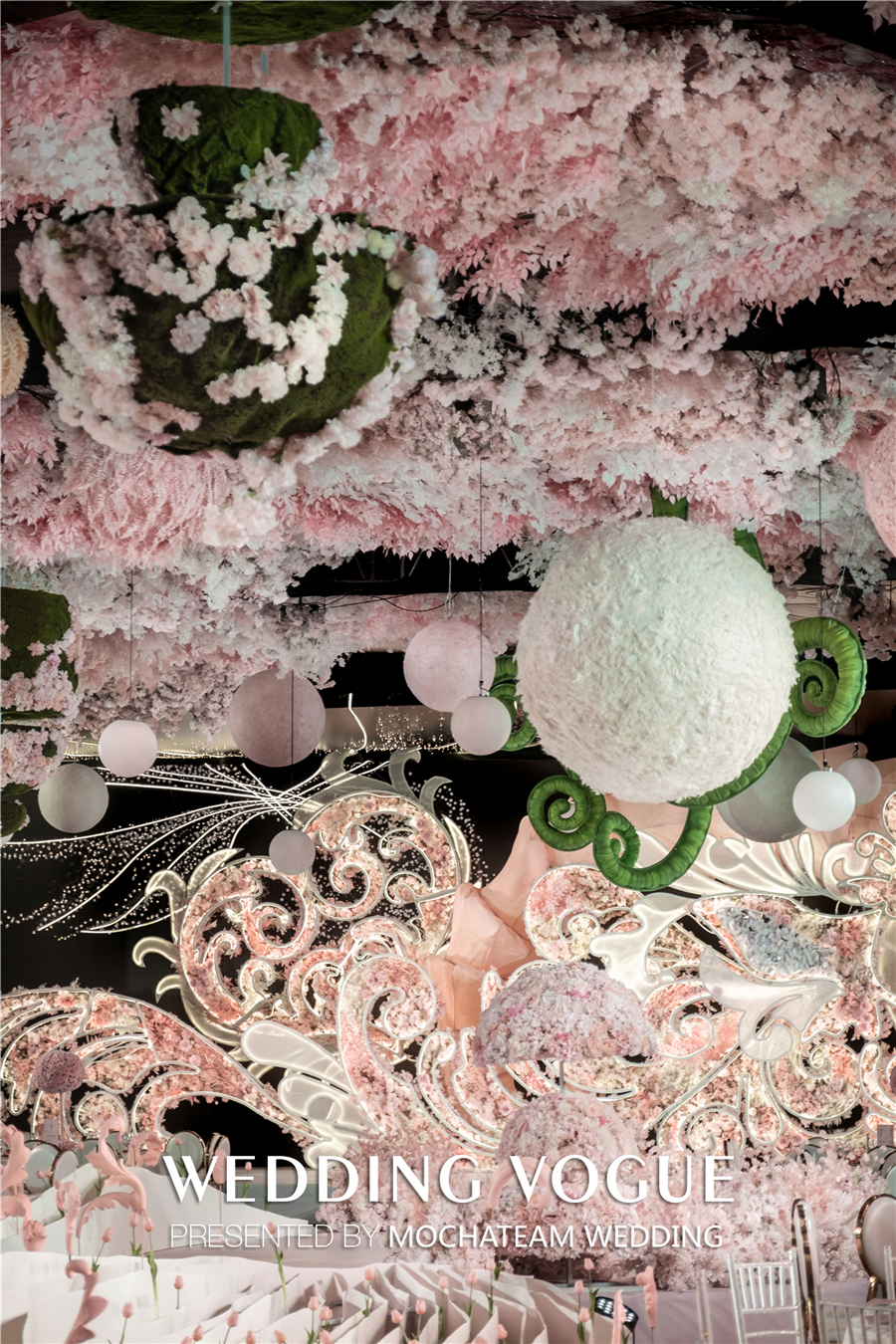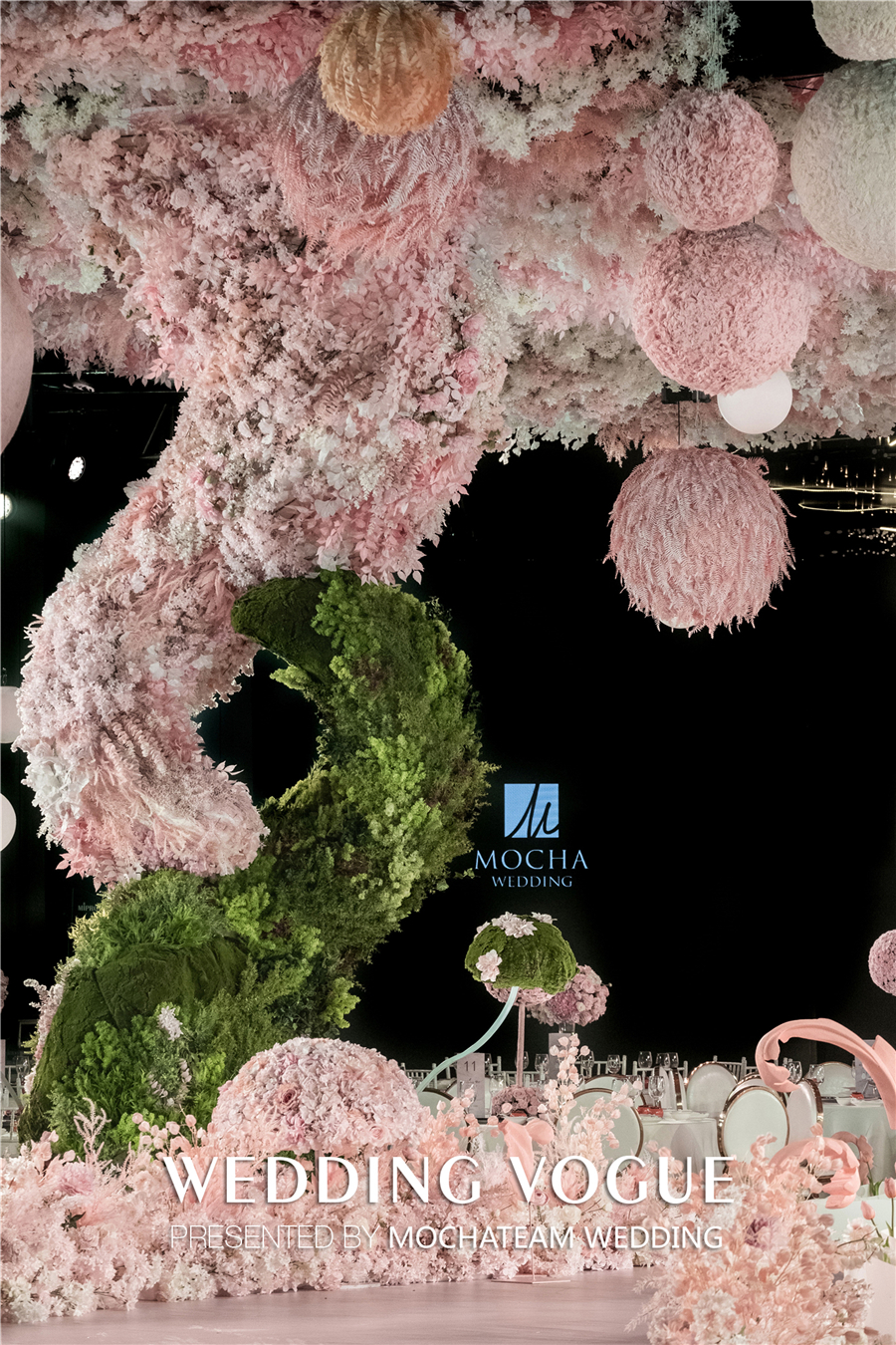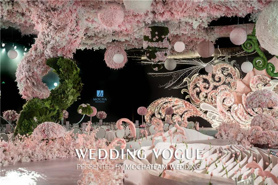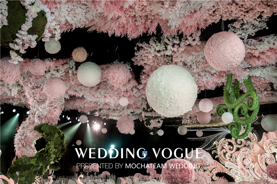 从童话中取得灵感,“筑梦师”决定在婚礼现场“种下”一颗神奇的种子,种子生长出从吊顶蜿蜒绿色藤蔓,散发着勃勃生机。随之又开出了大片粉色的花海,一路肆意生长。