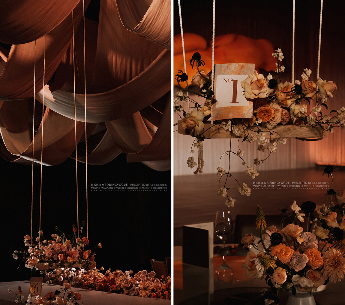 一个个灵动的秋千花艺垂挂,与每一桌的桌花相对应,超级有趣。