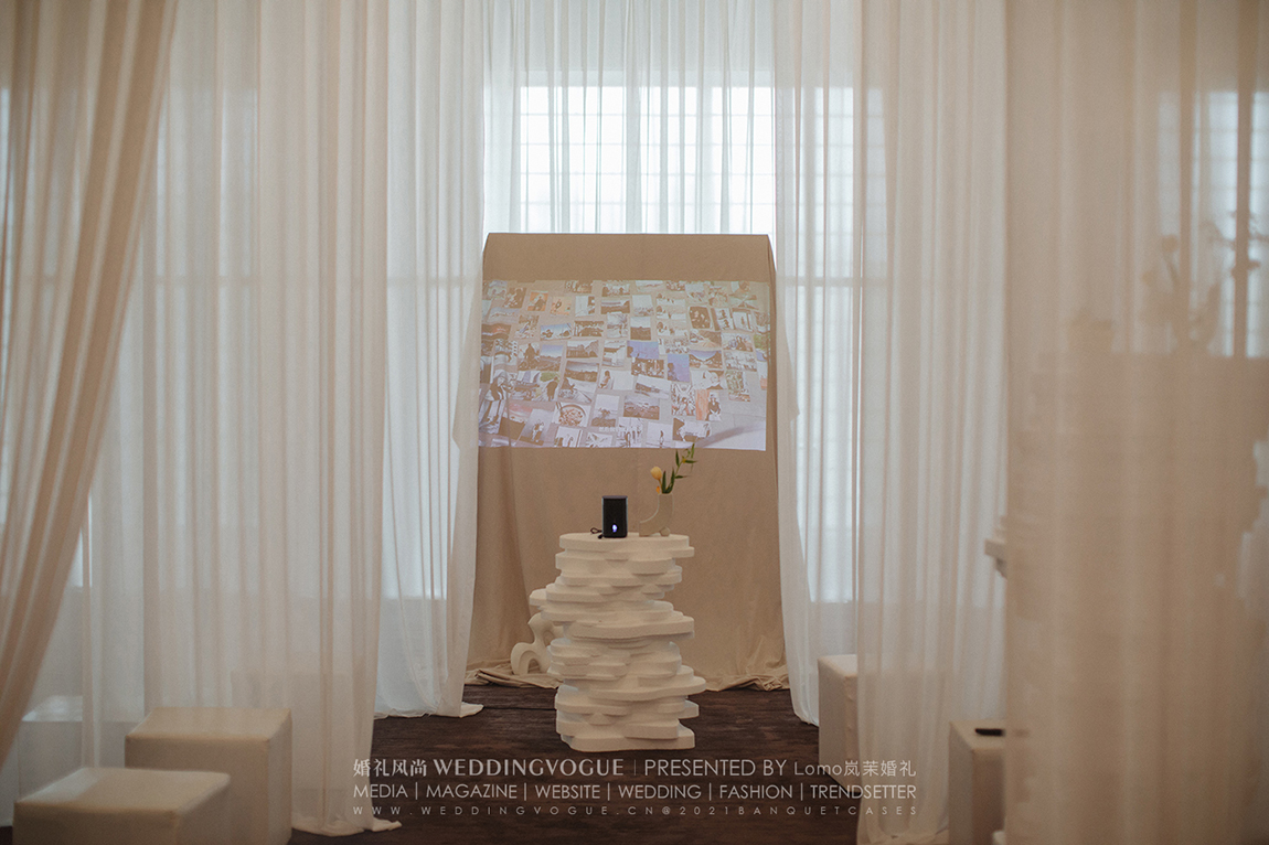 幕帘垂下,神秘而唯美。投影上播放着他们的爱情短片,去过的地方、收集的车票、经历的事情,让宾客从一开始就有了沉浸式的体验。