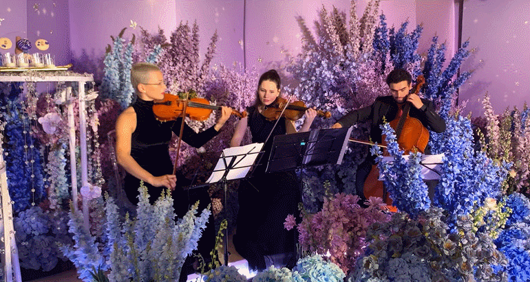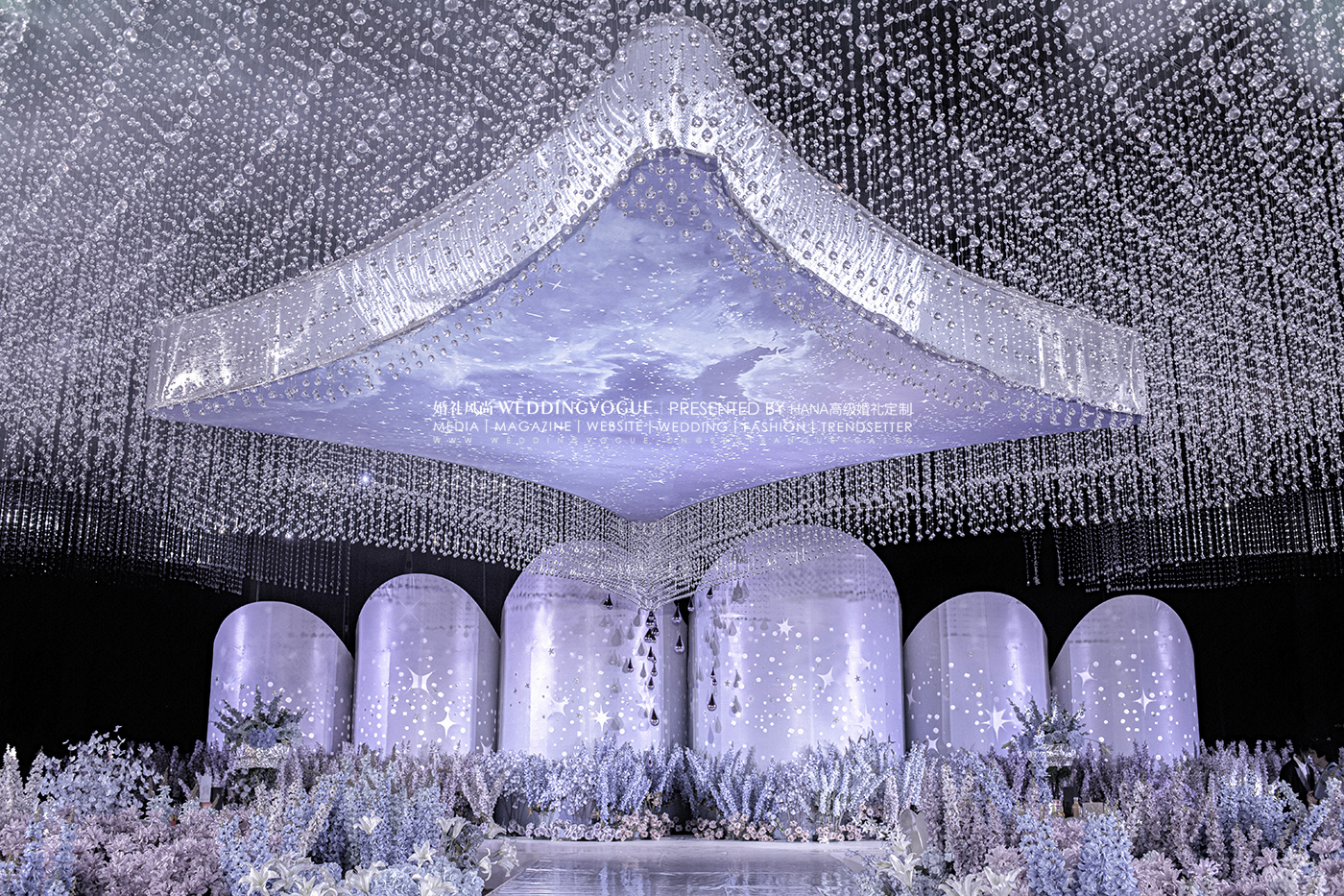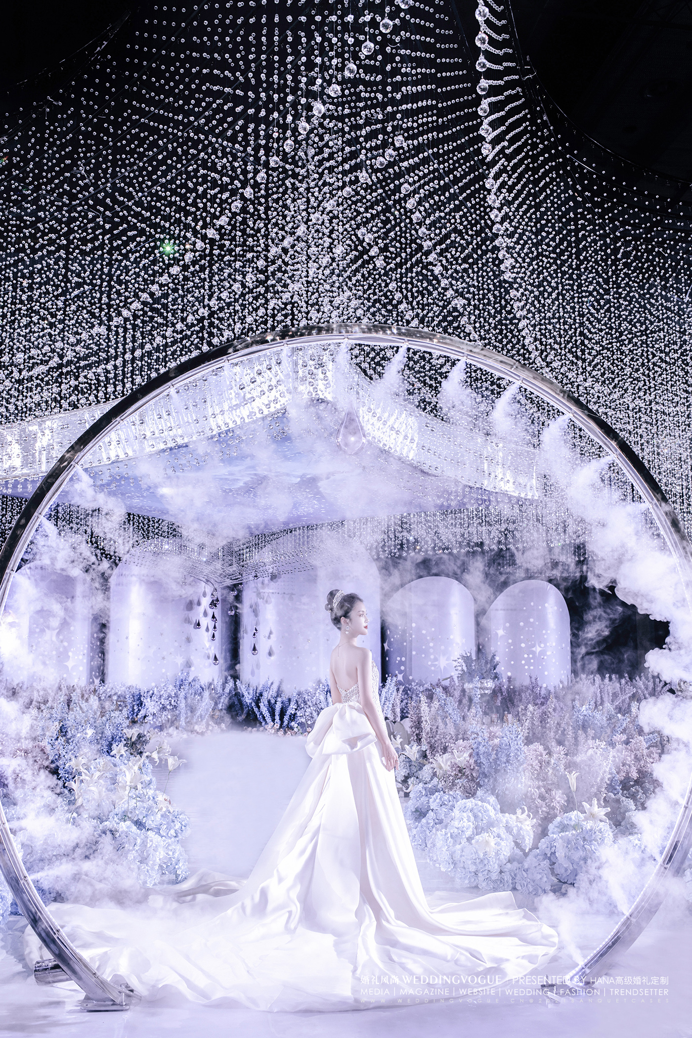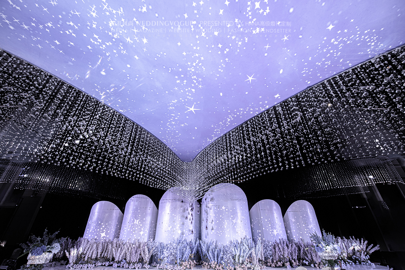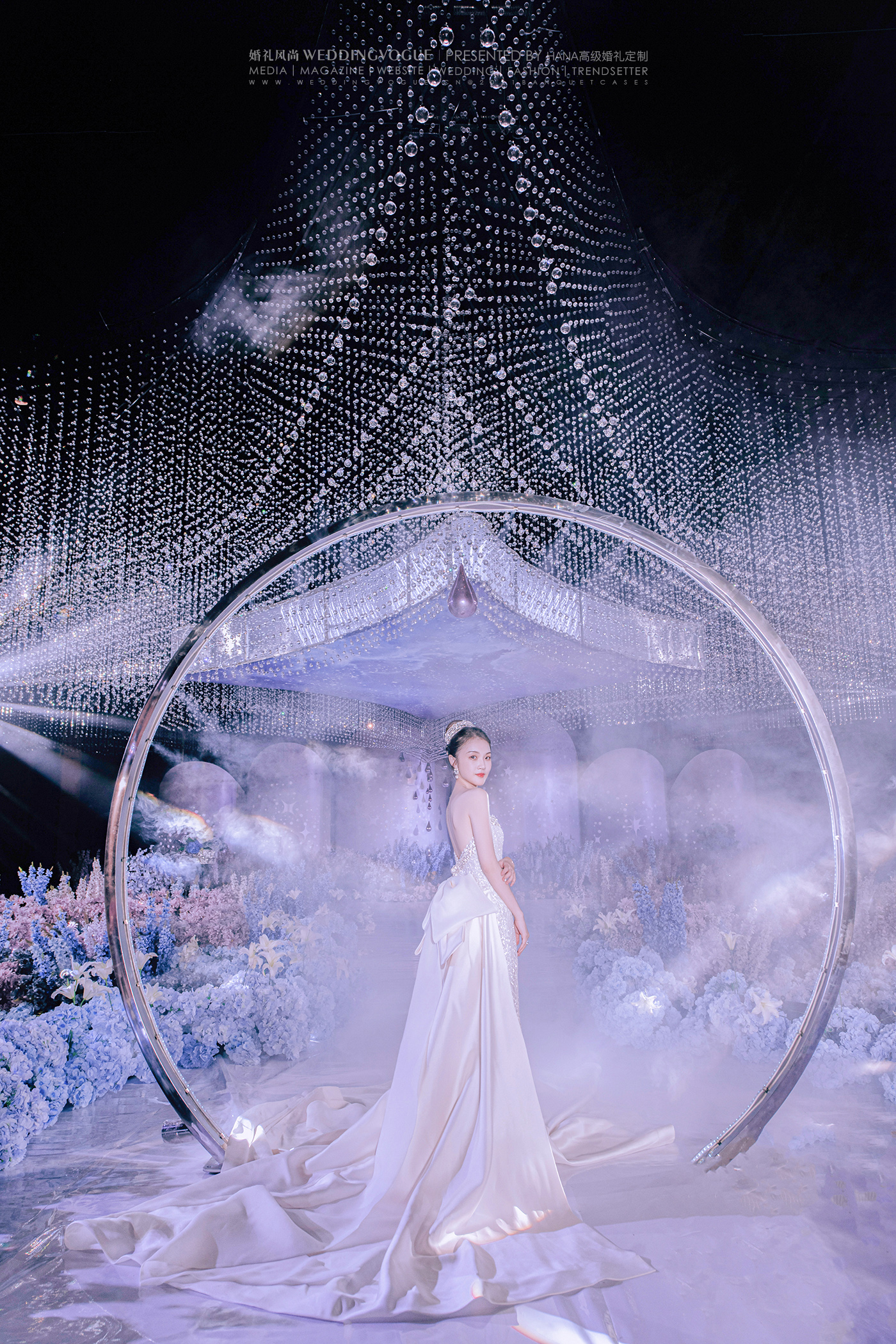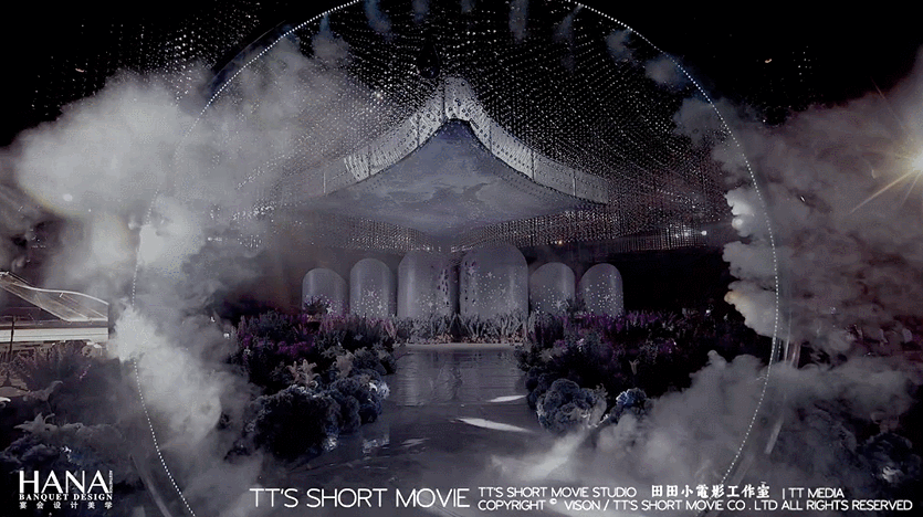 在如迷雾仙境般烟波浩渺、光影交错的氛围空间中,配着一曲曲舒缓动听的钢琴曲、小提琴曲和合奏曲,婚礼仪式如期进行,宾客们围坐一隅,享受其中也享受婚礼本身传达的永恒爱意,久久流连。