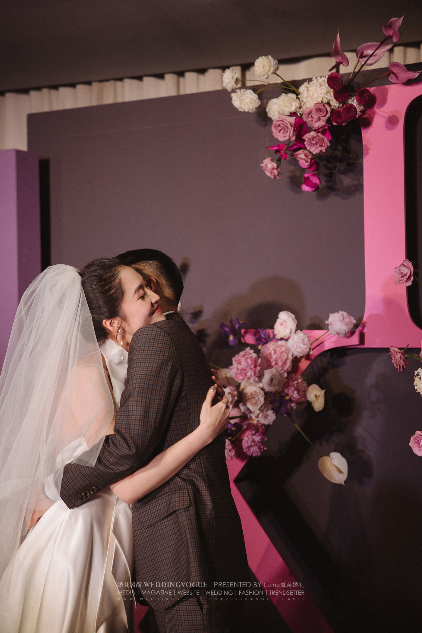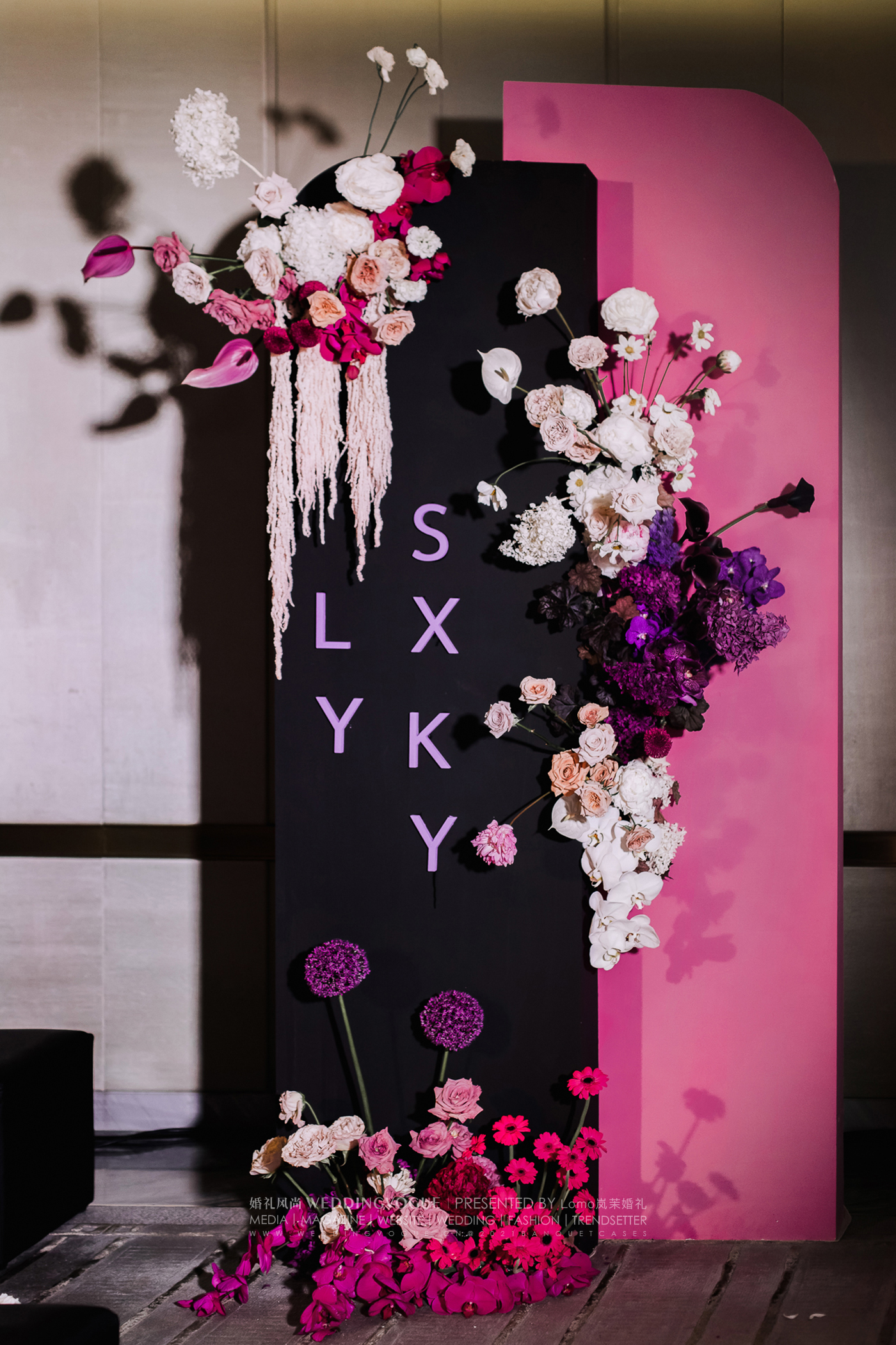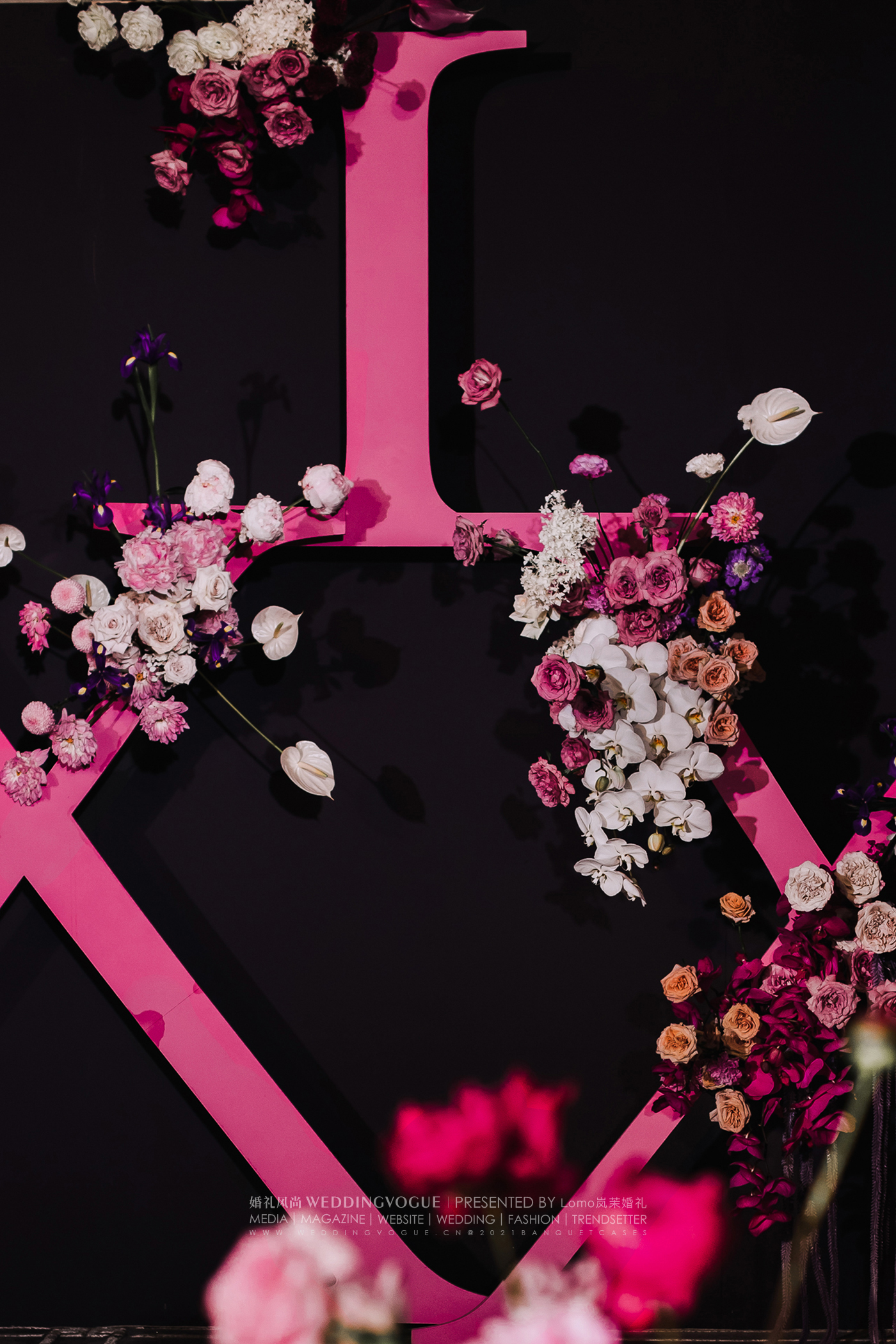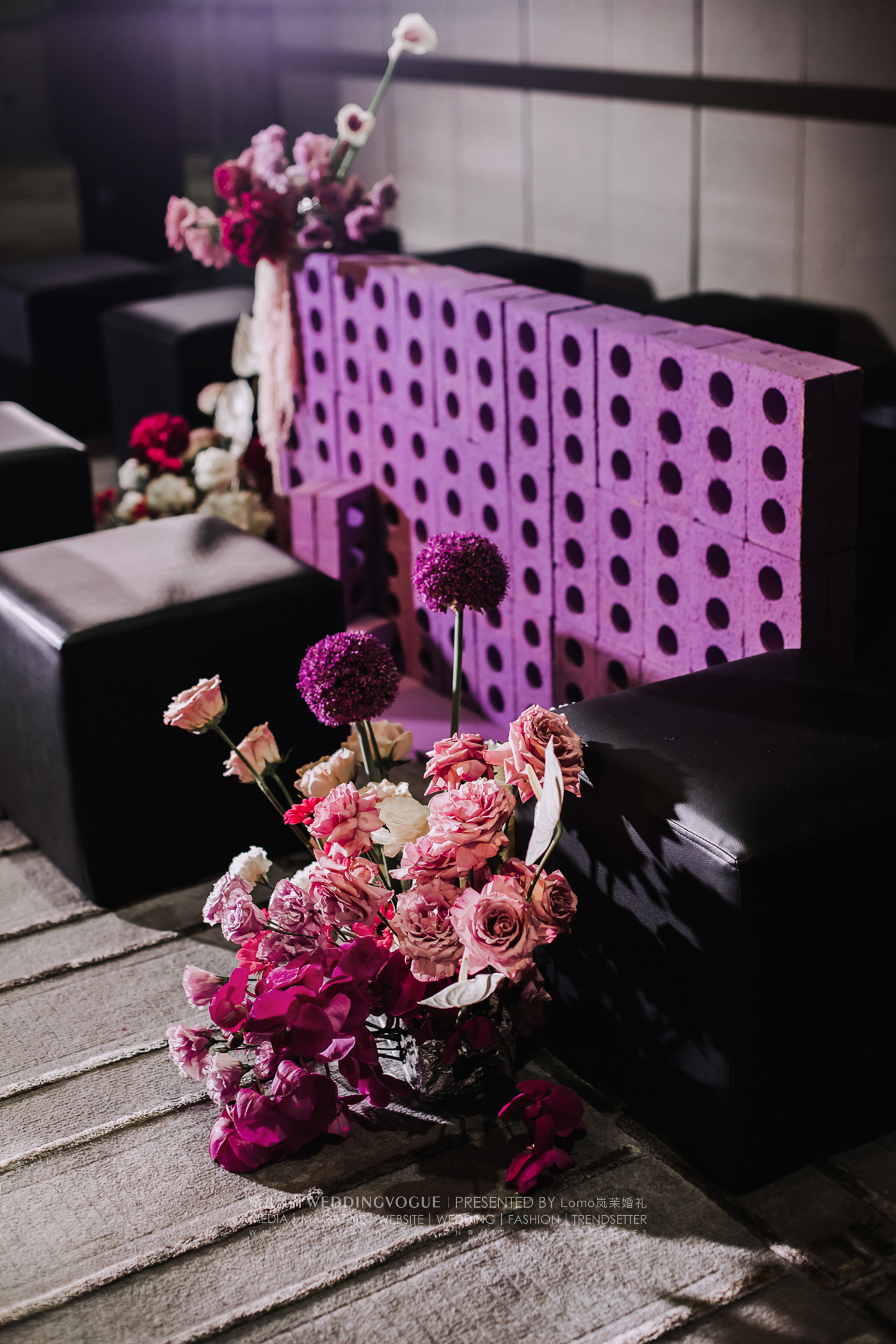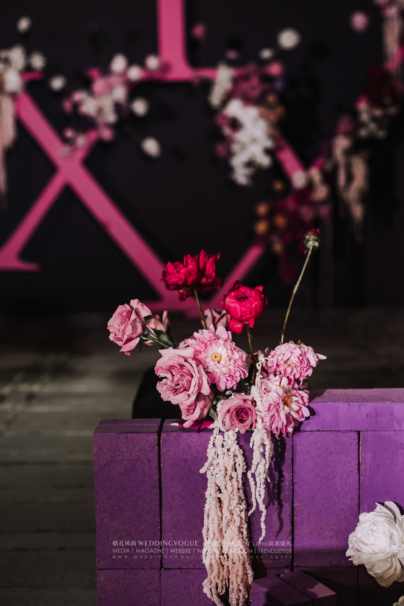 现场的花艺也是一大亮点,白色、浅粉、玫红、深紫,由浅至深的碰撞,中和硬朗的线条,显得格外温柔。