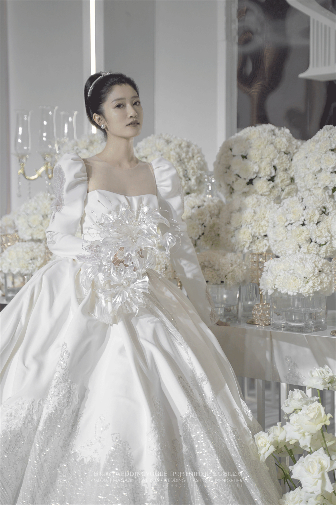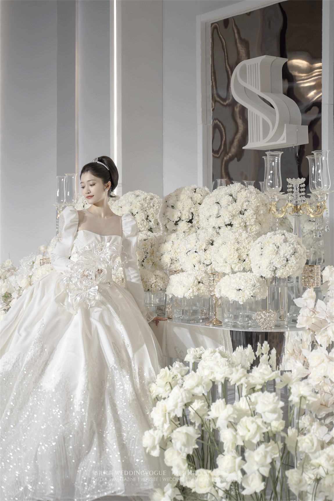 与仪式区大空间不同,皇后婚礼在迎宾区的设计上依然选择圣洁的白色,通过大量鲜花,以及不同材质映射出不同的程度的白色增加层次感。