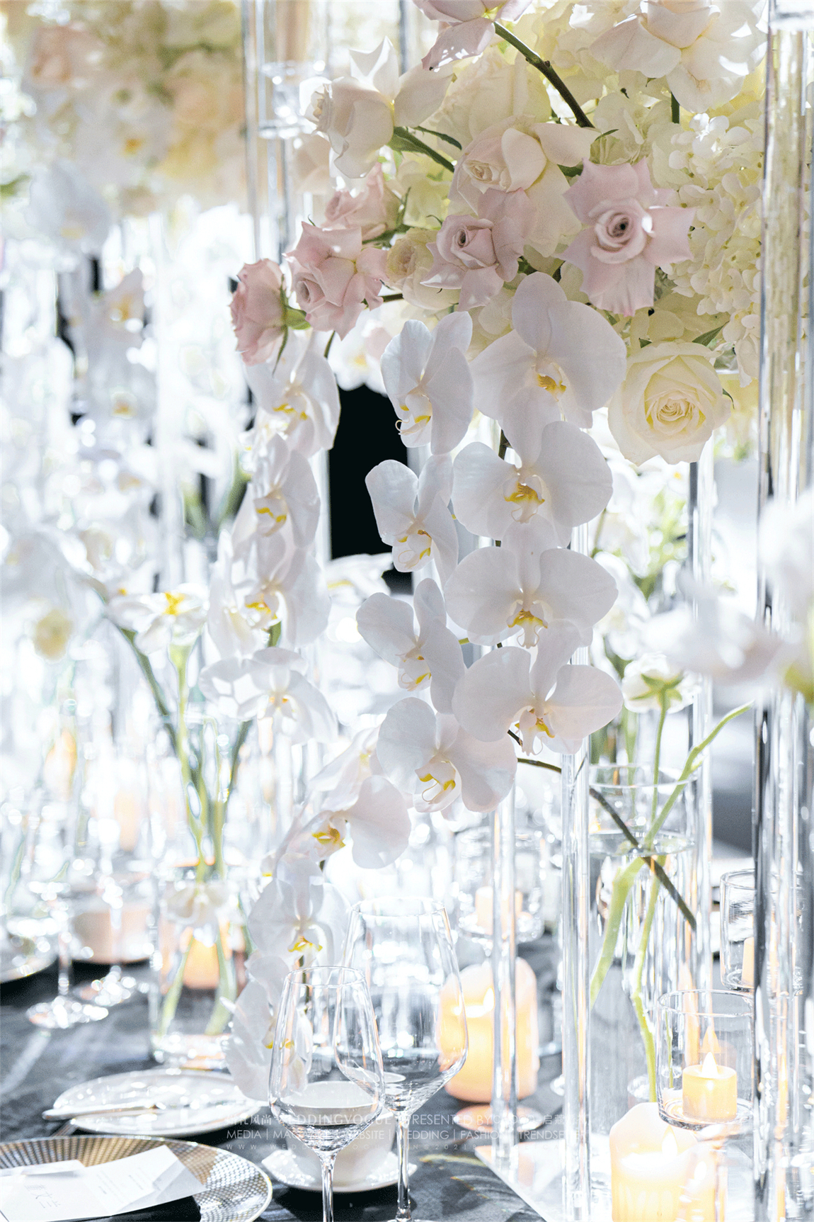纯白色系花艺,搭配这个简约通透的氛围极其恰当。