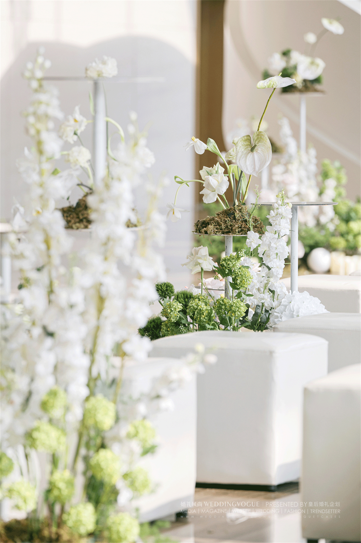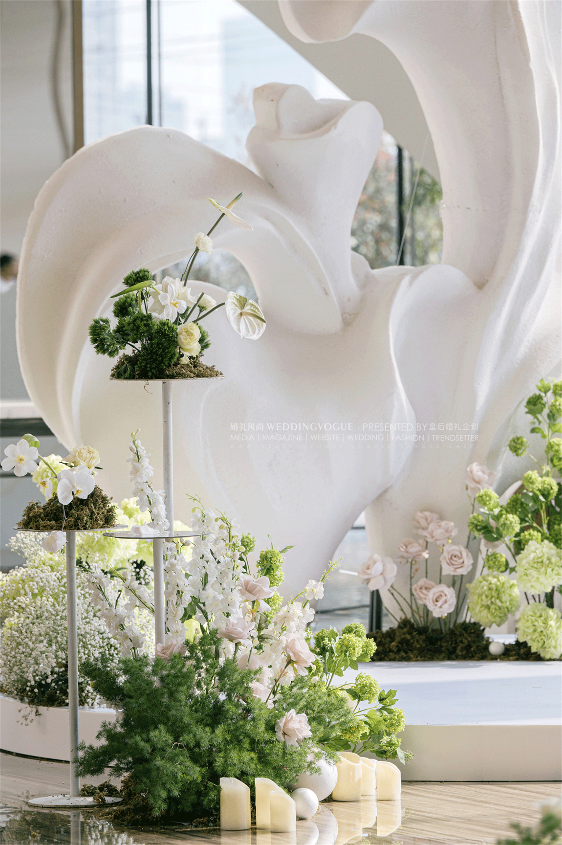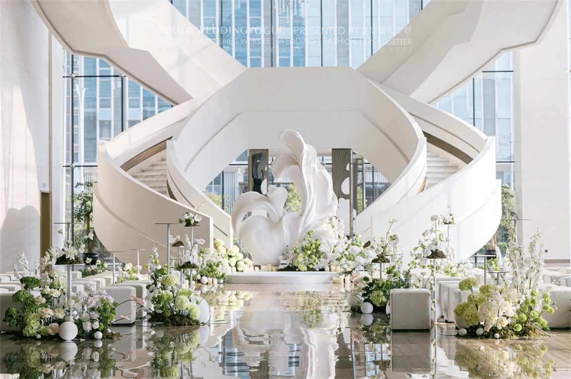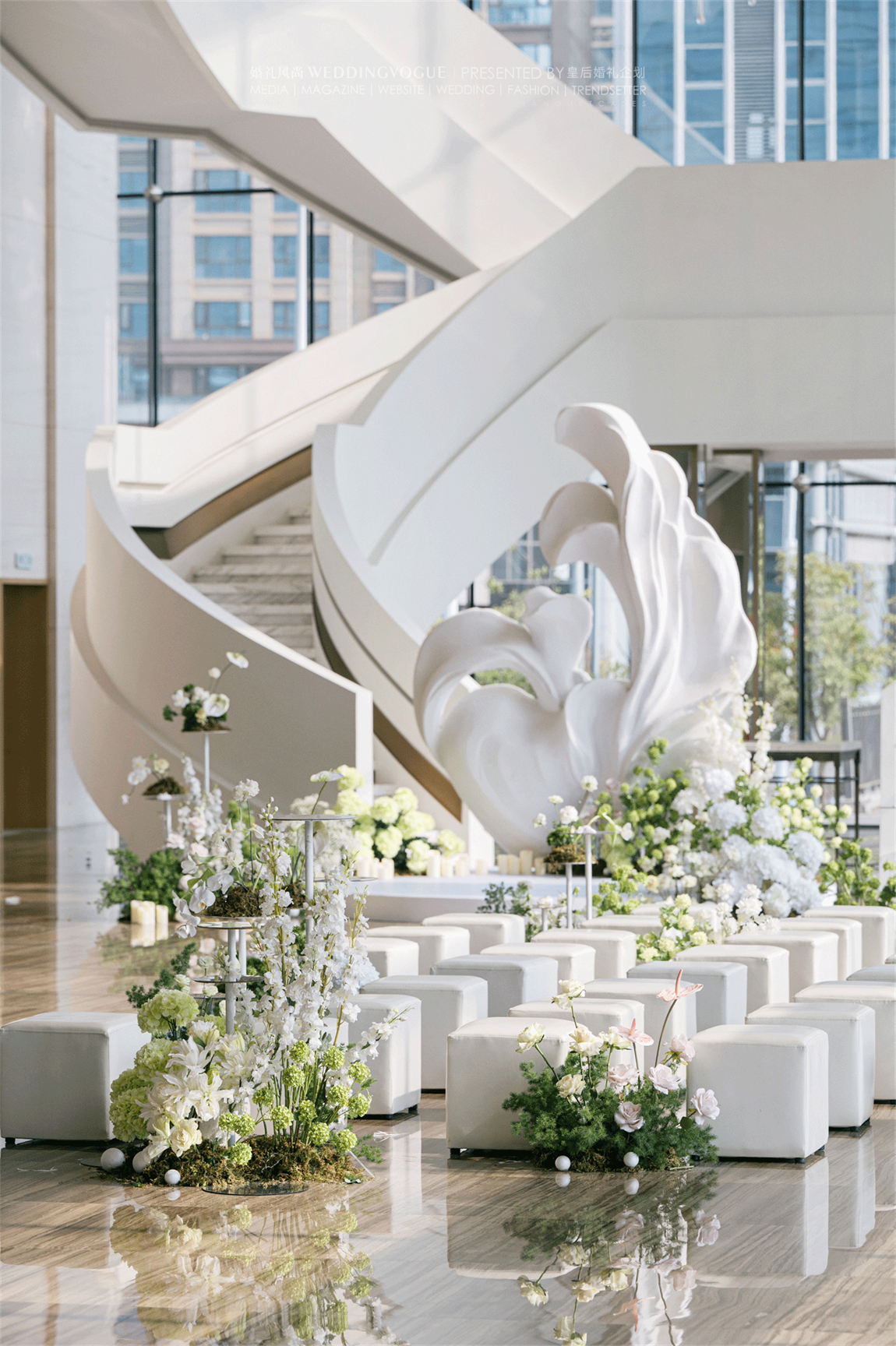 选择阳光长廊作为仪式区域的婚礼场景设计,皇后婚礼借助旋转楼梯的曲线,以简洁清新的白绿配色,打造仙气有野趣的半户外仪式场景。