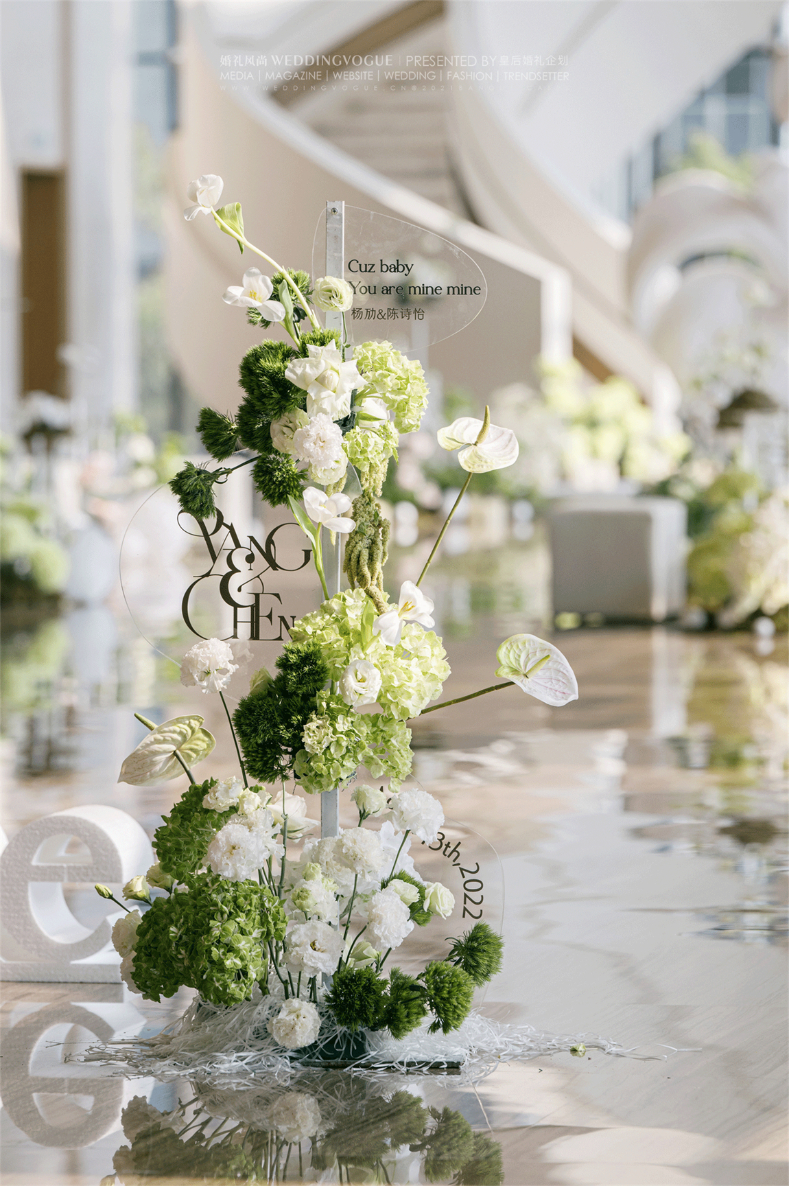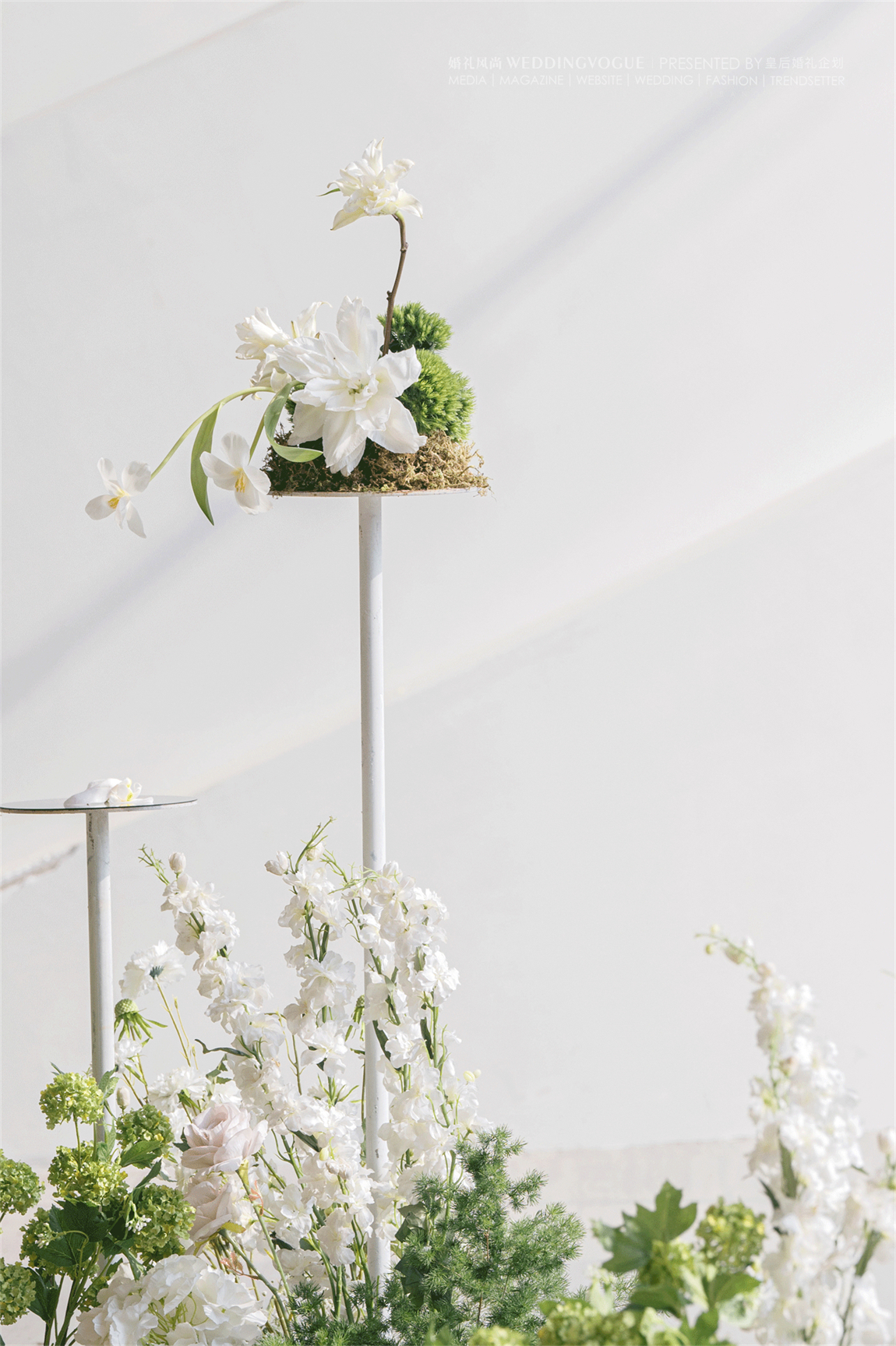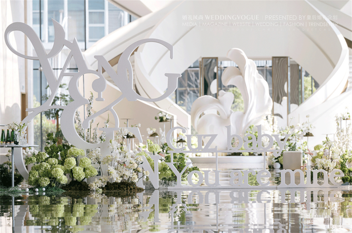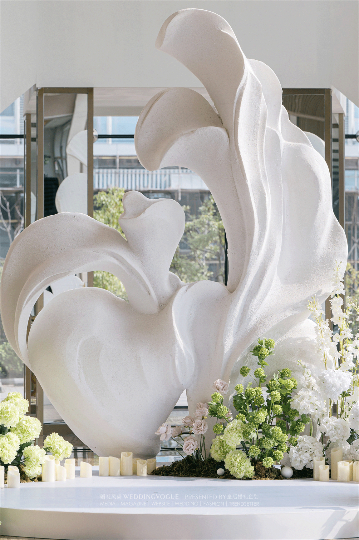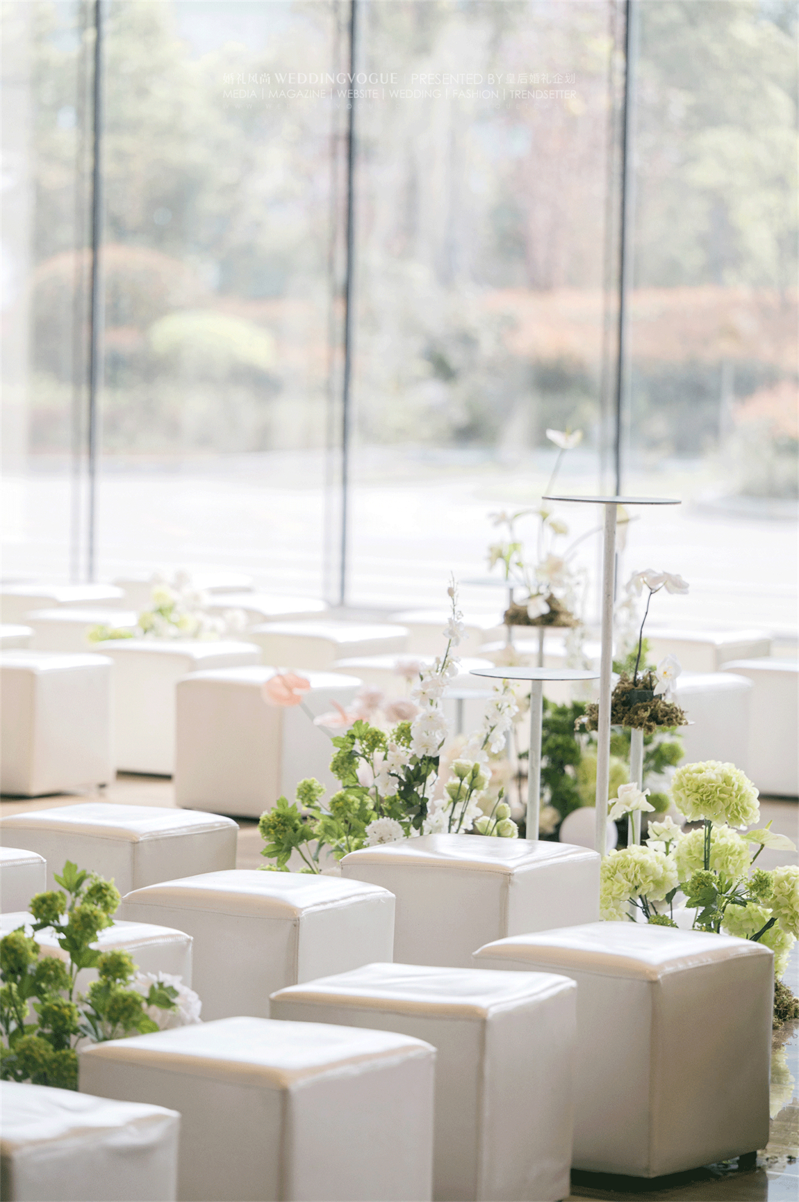 选择阳光长廊作为仪式区域的婚礼场景设计,皇后婚礼借助旋转楼梯的曲线,以简洁清新的白绿配色,打造仙气有野趣的半户外仪式场景。