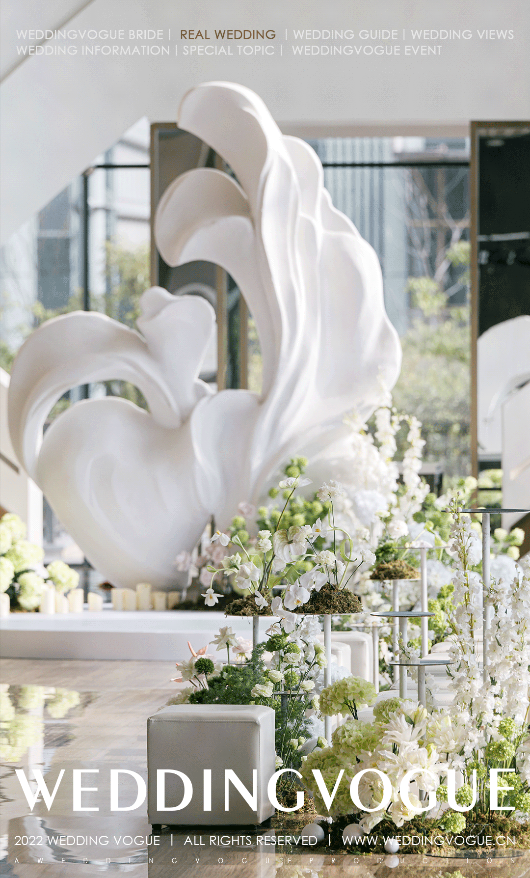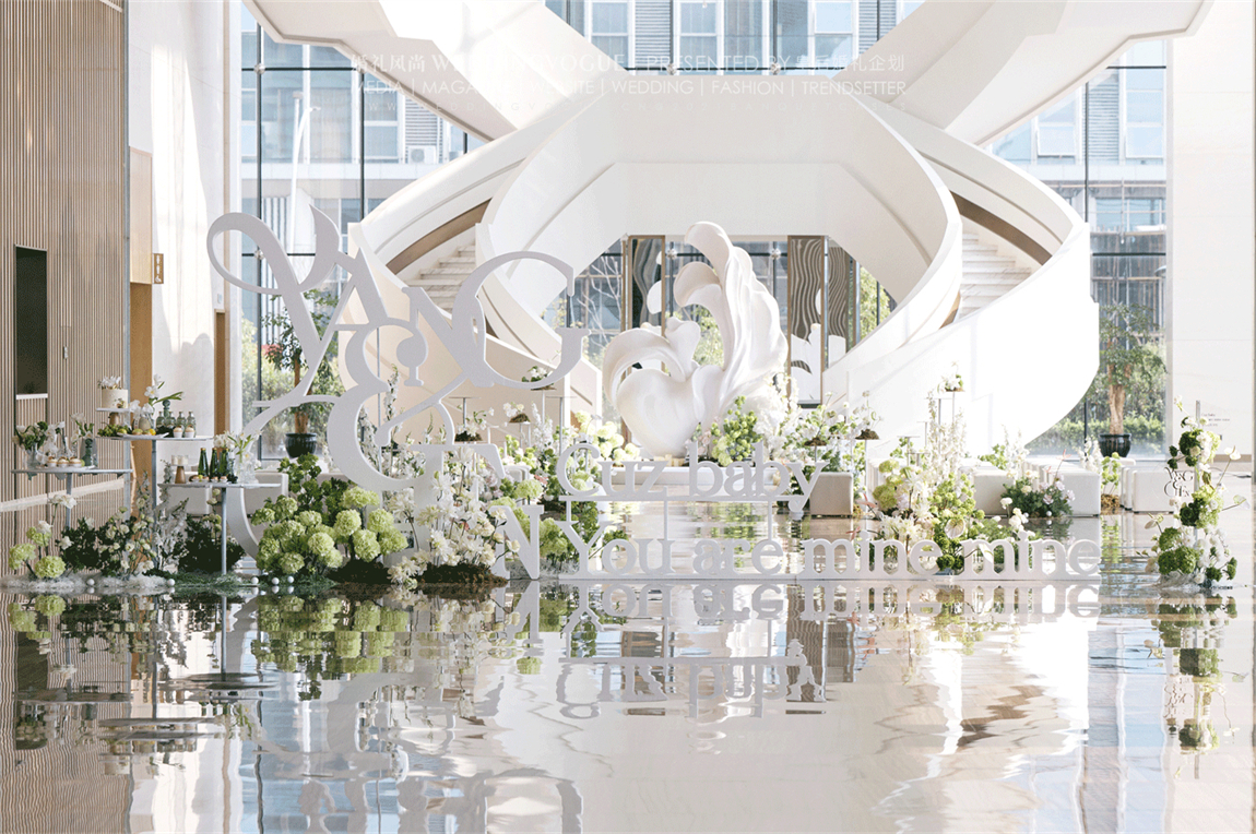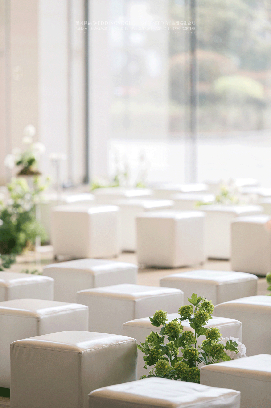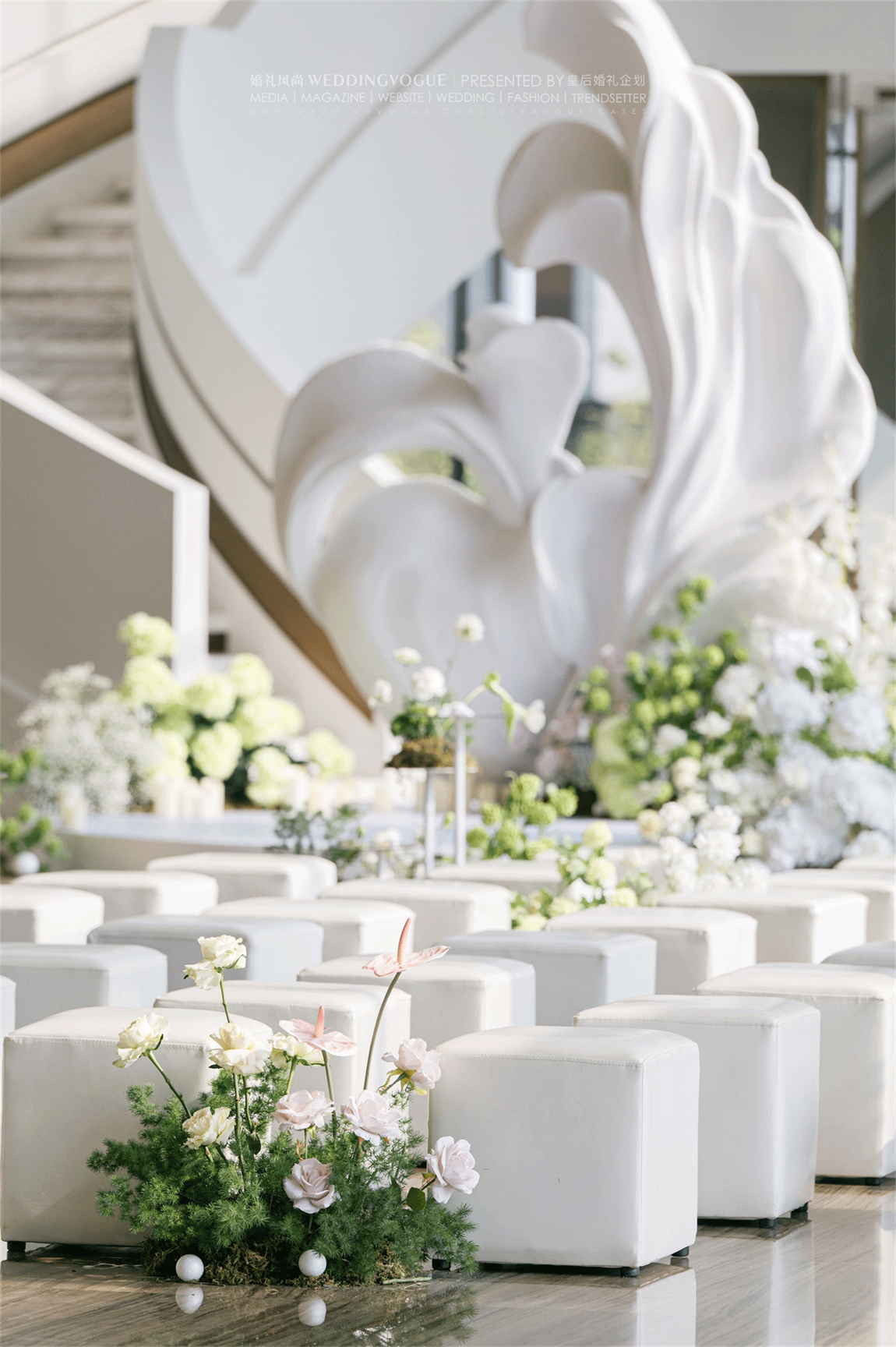 选择阳光长廊作为仪式区域的婚礼场景设计,皇后婚礼借助旋转楼梯的曲线,以简洁清新的白绿配色,打造仙气有野趣的半户外仪式场景。