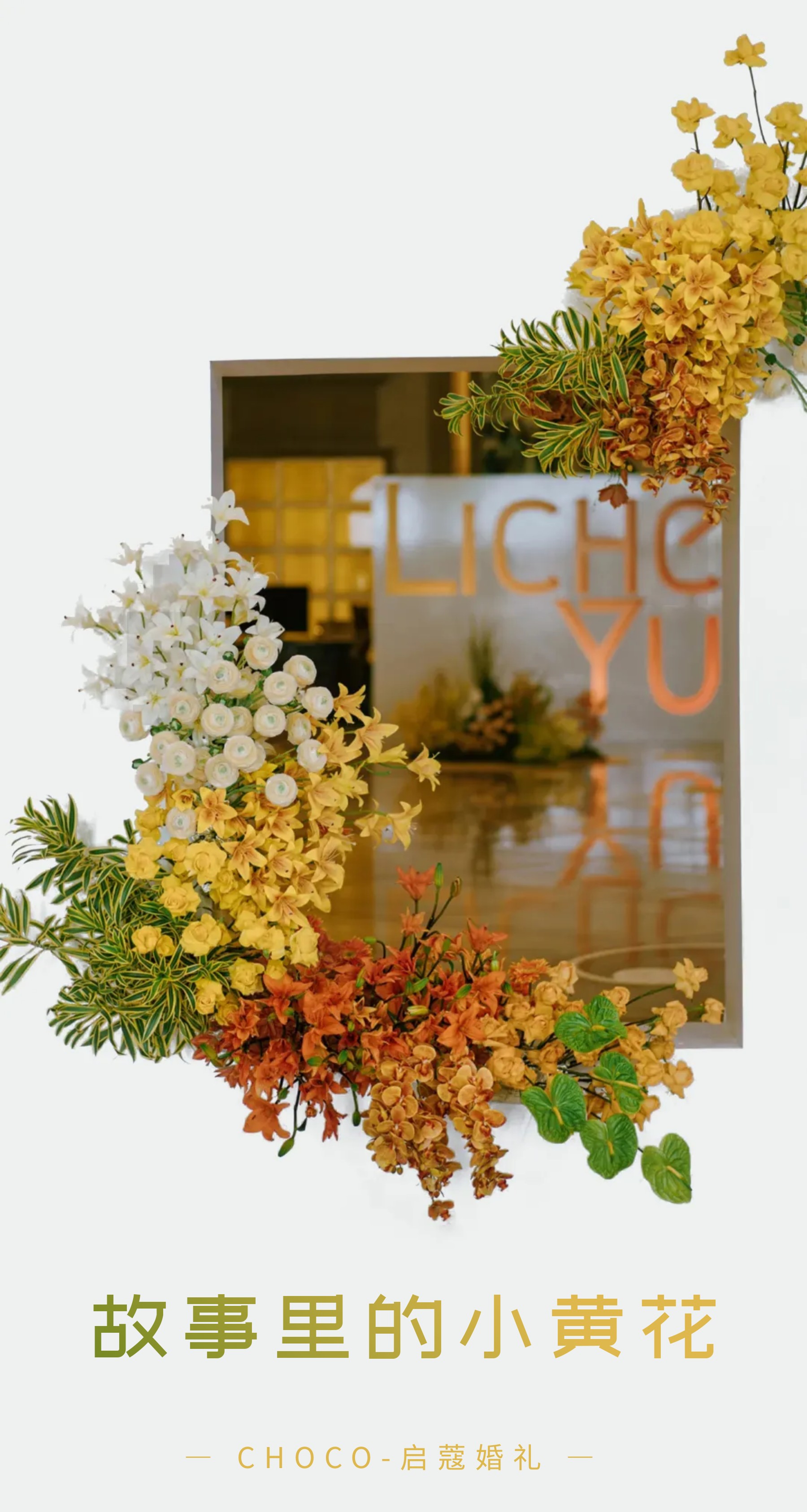 基于他们的故事,CHOCO-启蔻婚礼设计师选择用白色、柠檬黄、绿色、橙色来为他们打造一场活泼可爱、充盈着青春气息的婚礼,“故事里的小黄花”,自然也就成了这场婚礼的主题。