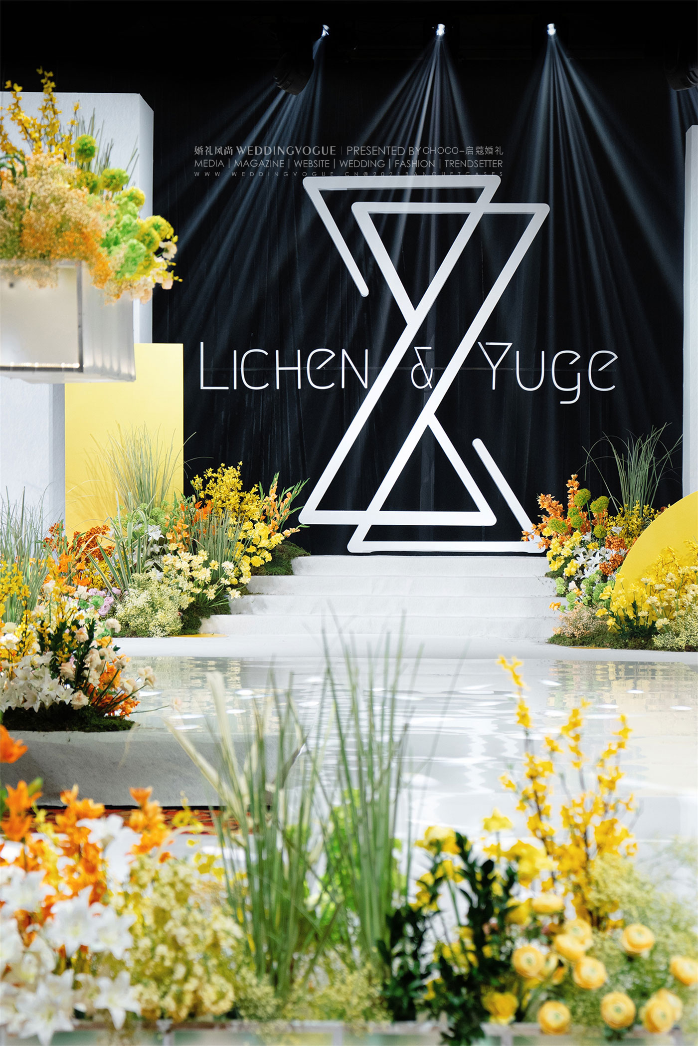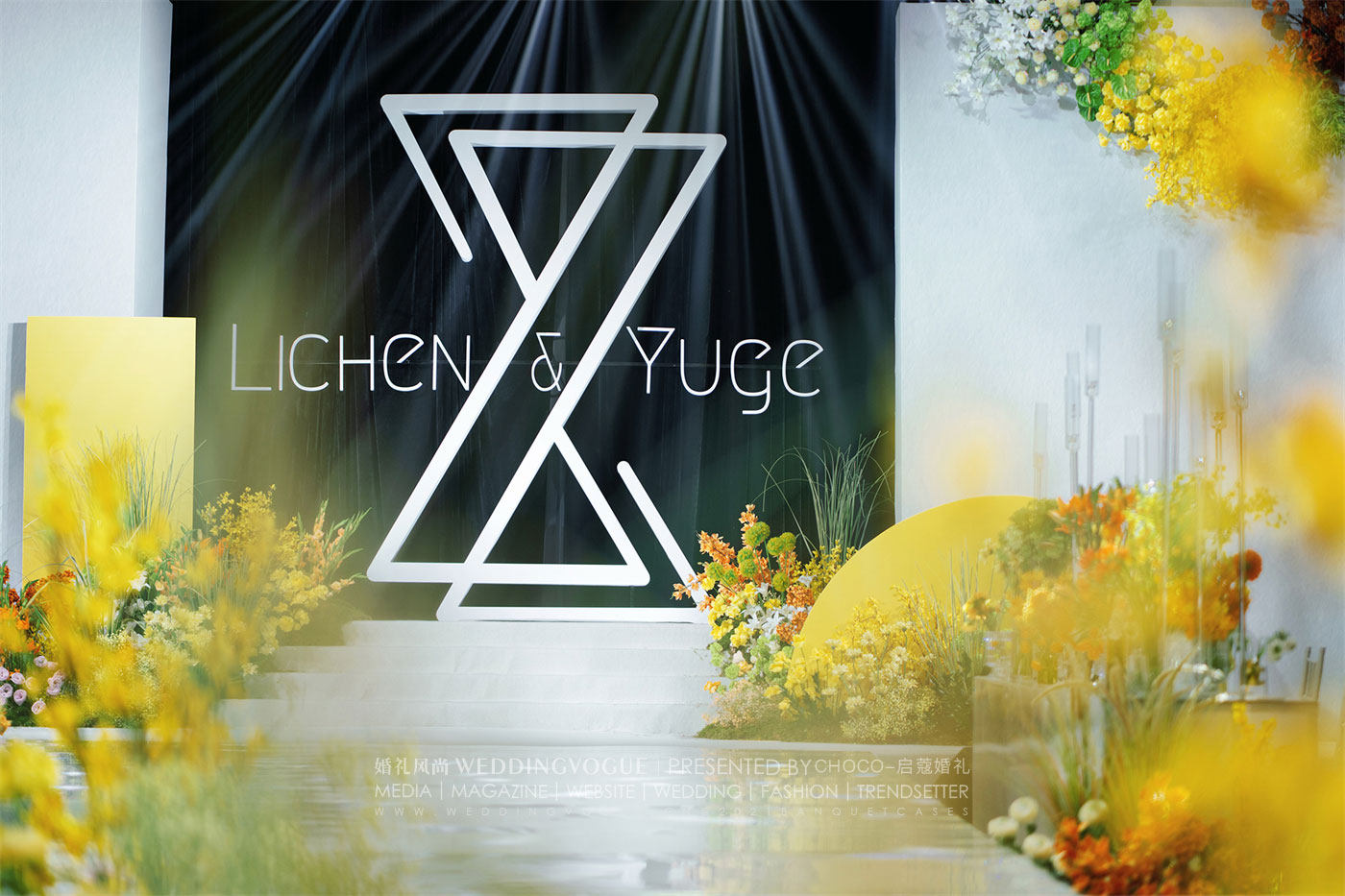 在活泼之外,当然也不能忽略了婚礼本身的庄重。在仪式区的主背景处,一个取自新人姓名首字母“L”和“Y”设计而成的婚礼logo成为了整个现场的视觉焦点。
