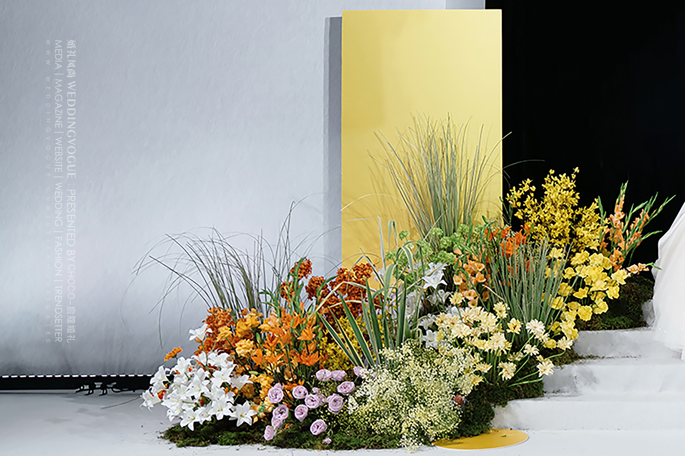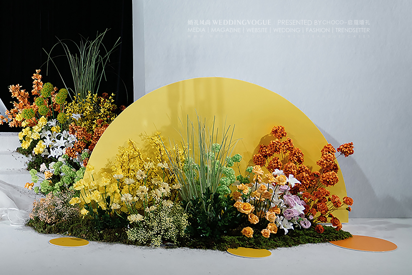 透过磨砂质感的板材去看明黄色系的花花草草和纯白的光,使目之所及多了些朦胧美感,别有意韵。而棕红色丝线构成的艺术装置,连接了地面与空中,如同一束束可见可触的光,作为婚礼现场最吸睛的一抹色彩,展现出化腐朽为神奇的设计妙笔。