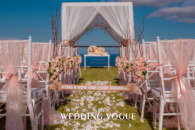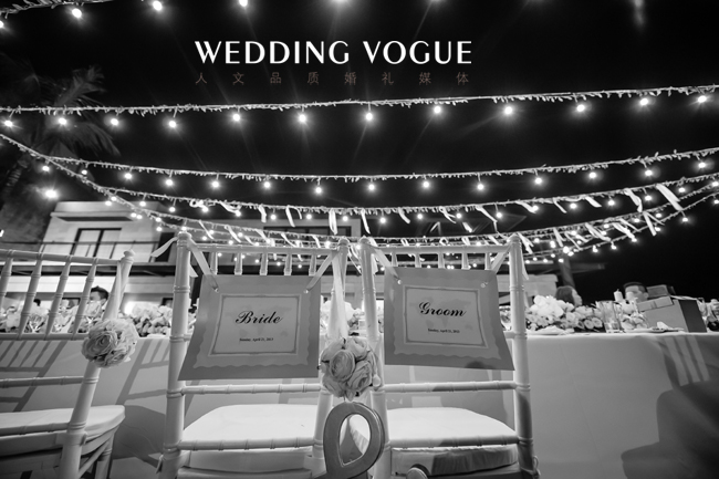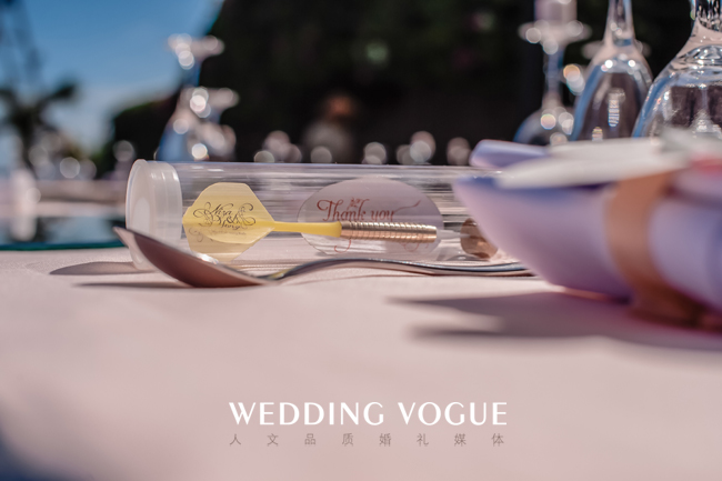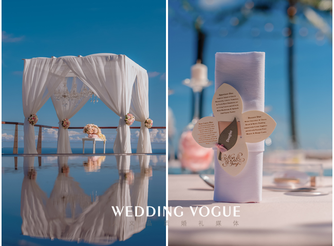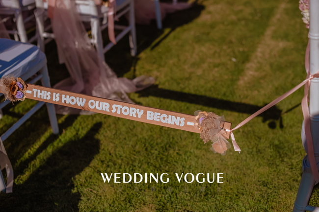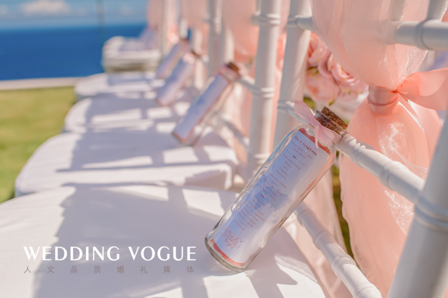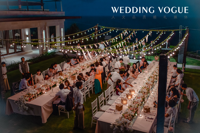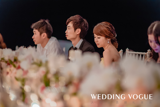 这场婚礼走的是粉色梦幻风,一般粉色梦幻都会采用比较柔和的手法来呈现,但我们这次决定用一些玻璃反射的概念来制作,订制了粉色桌布,而在长桌上放了晶莹剔透的镜子增加明亮的感觉,roof top绑上星星灯跟缎带可以让现场的色调看起来更加浪漫,然后桌花色系主要是粉色、白色、蜜桃色,头尾两端用白色的兰花做出垂坠度,为了让整体感能够丰富些,我们把大大小小不同高度的酒杯倒扣着,上面摆着蜡烛装饰,里面依照不同的杯器容量放入了玫瑰花,如此一来亮晶晶梦幻的粉色系主桌就完成啦。